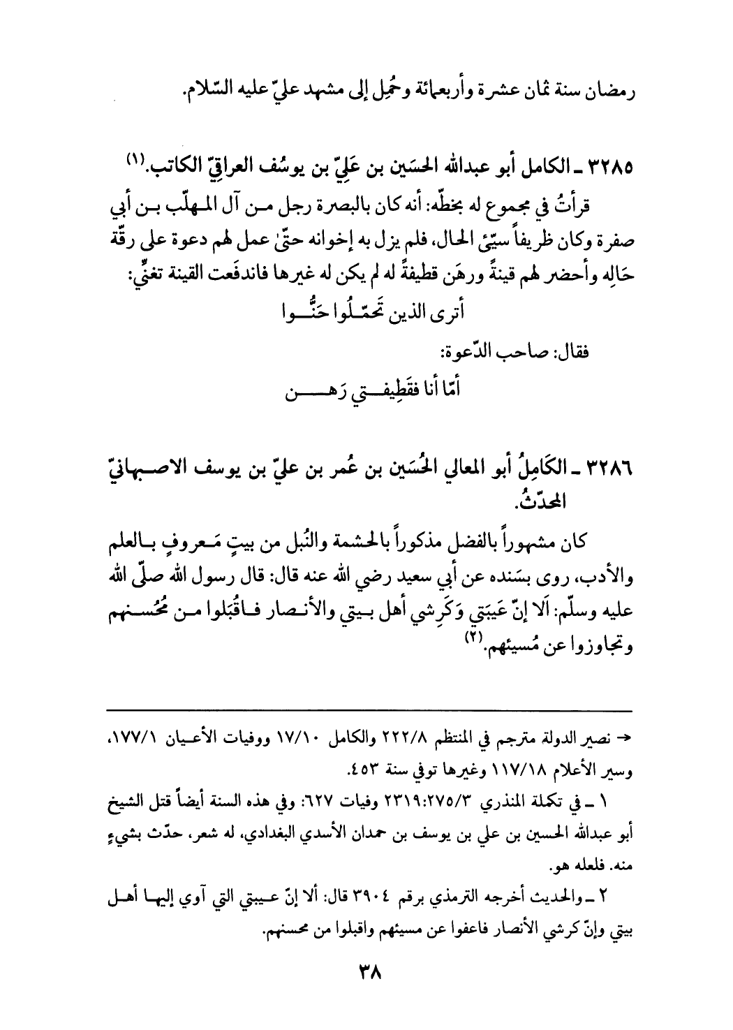 (¬1) في تكملة المنذري 275/ 3: 2319 وفيات 627: وفي هذه السنة أيضا قتل الشيخ أبو عبد الله الحسين بن علي بن يوسف بن حمدان الأسدي البغدادي، له شعر، حدّث بشيء منه. فلعله هو.