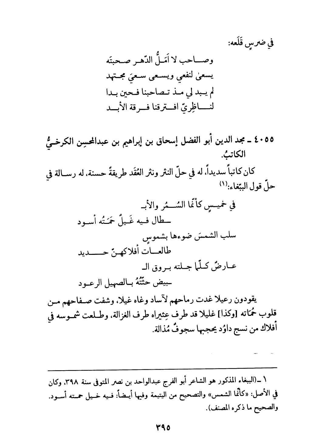 (¬1) (الببغاء المذكور هو الشاعر أبو الفرج عبد الواحد بن نصر المتوفى سنة 398، وكان في الأصل: «كأنّما الشمس» والتصحيح من اليتيمة وفيها أيضا: فيه خيل حمته أسود. والصحيح ما ذكره المصنف).