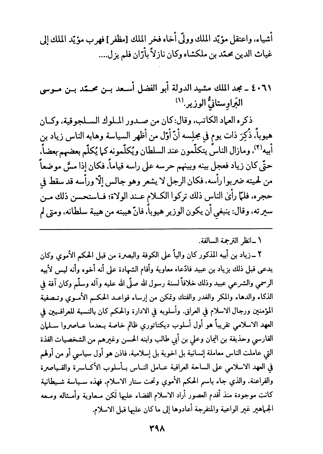 (¬2) زياد بن أبيه المذكور كان واليا على الكوفة والبصرة من قبل الحكم الأموي وكان يدعى قبل ذلك بزياد بن عبيد فادّعاه معاوية وأقام الشهادة على أنه أخوه وأنه ليس لأبيه الرسمي والشرعي عبيد وذلك خلافا لسنة رسول الله صلّى الله عليه وآله وسلّم وكان آفة في الذكاء والدهاء والمكر والغدر والفتك وتمكن من إرساء قواعد الحكم الأموي وتصفية المؤمنين ورجال الاسلام في العراق. وأسلوبه في الادارة والحكم كان بالنسبة للعراقيين في العهد الاسلامي تقريبا هو أول أسلوب ديكتاتوري ظالم خاصة بعد ما عاصروا سلمان الفارسي وحذيفة بن اليمان وعلي بن أبي طالب وابنه الحسن وغيرهم من الشخصيات الفذة التي عاملت الناس معاملة إنسانية بل اخوية بل إسلامية، فاذن هو أول سياسي أو من أولهم في العهد الاسلامي على الساحة العراقية عامل الناس بأسلوب الأكاسرة والقياصرة والفراعنة، والذي جاء باسم الحكم الأموي وتحت ستار الاسلام، فهذه سياسة شيطانية كانت موجودة منذ أقدم العصور أراد الاسلام القضاء عليها لكن معاوية وأمثاله ومعه الجماهير غير الواعية والمتفرجة أعادوها إلى ما كان عليها قبل الاسلام.