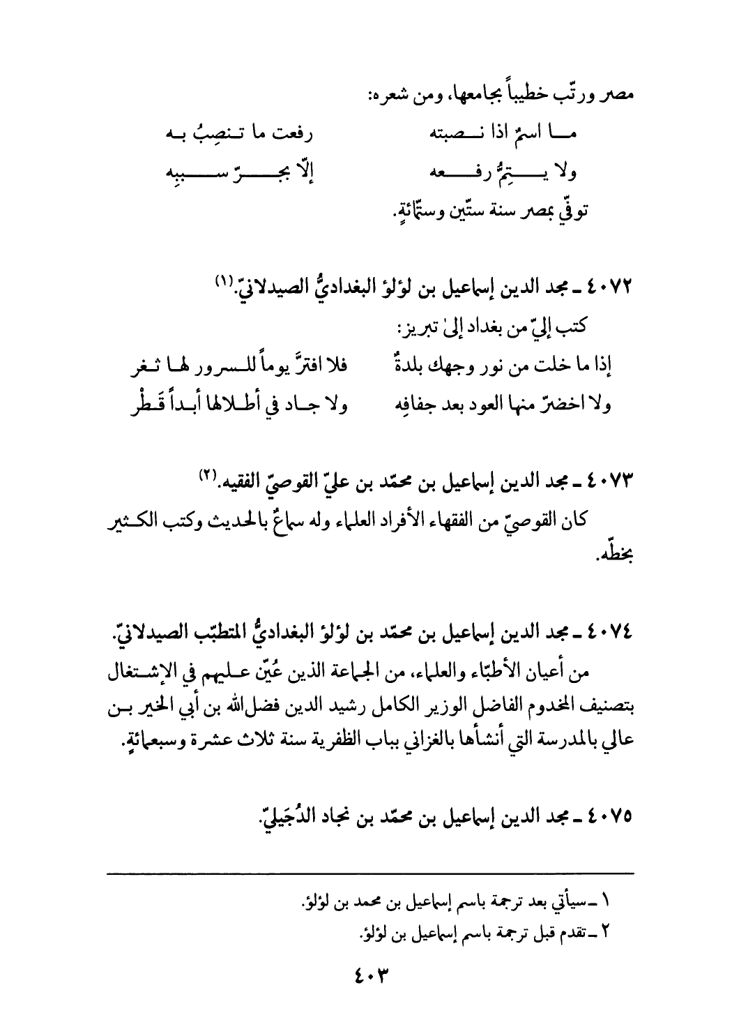 4074 - مجد الدين إسماعيل بن محمّد بن لؤلؤ البغداديّ المتطبّب الصيدلانيّ.