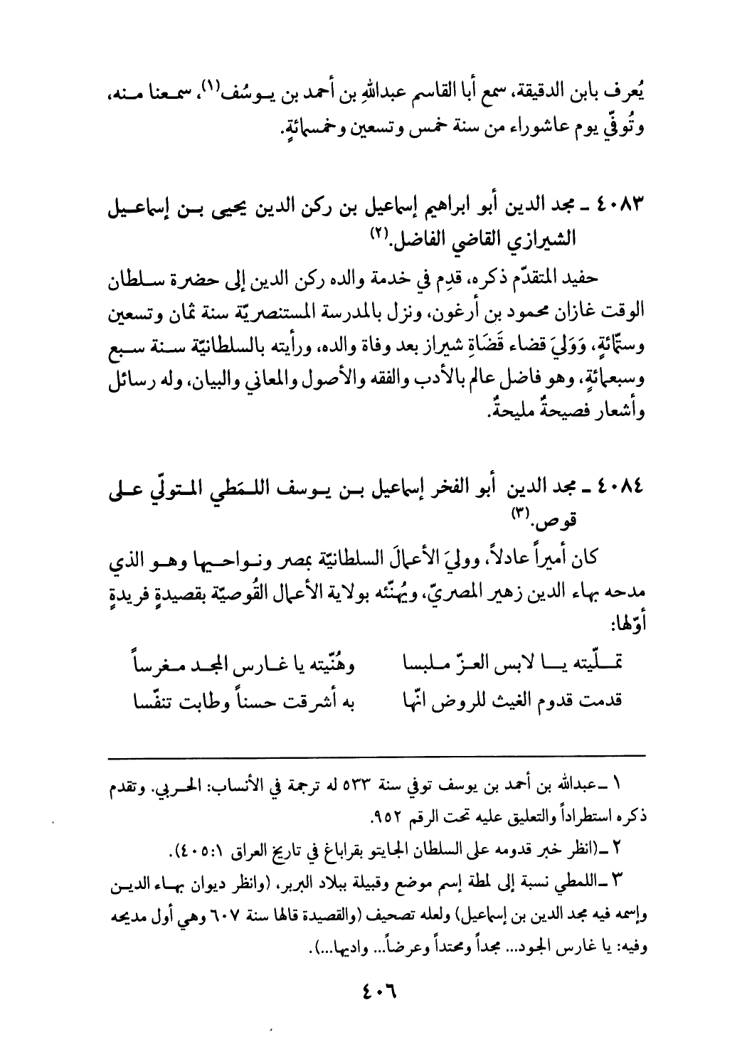 (¬3) اللمطي نسبة إلى لمطة اسم موضع وقبيلة ببلاد البربر، (وانظر ديوان بهاء الدين واسمه فيه مجد الدين بن إسماعيل) ولعله تصحيف (والقصيدة قالها سنة 607 وهي أول مديحه وفيه: يا غارس الجود ... مجدا ومحتدا وعرضا ... واديها ...).