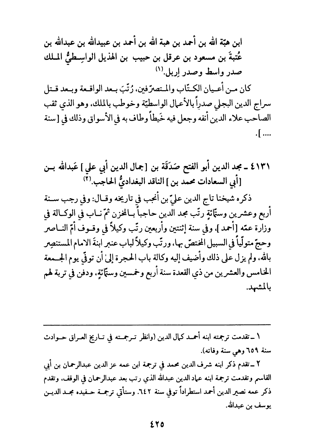(¬1) تقدمت ترجمته ابنه أحمد كمال الدين (وانظر ترجمته في التاريخ العراق حوادث سنة 659 وهي سنة وفاته).