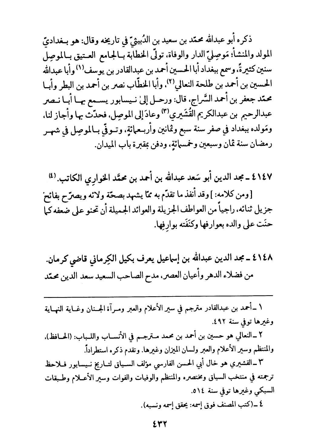 (¬1) أحمد بن عبد القادر مترجم في سير الأعلام والعبر ومرآة الجنان وغاية النهاية وغيرها توفي سنة 492.