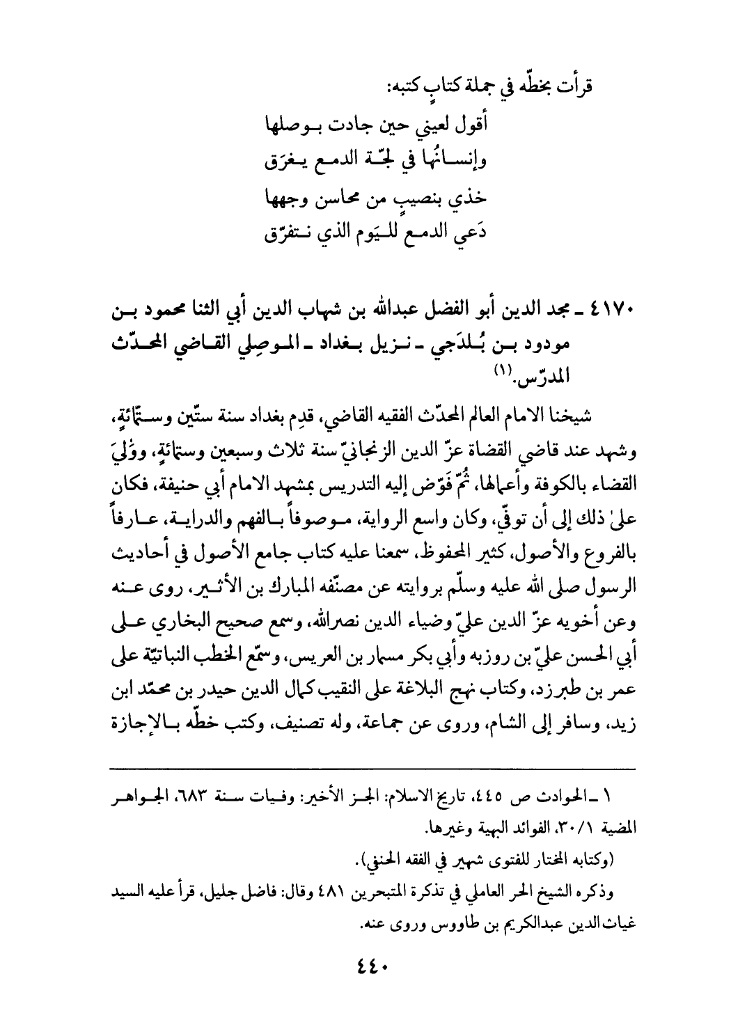 (¬1) الحوادث ص 445، تاريخ الاسلام: الجز الأخير: وفيات سنة 683، الجواهر المضية 30/ 1، الفوائد البهية وغيرها. (وكتابه المختار للفتوى شهير في الفقه الحنفي). وذكره الشيخ الحر العاملي في تذكرة المتبحرين 481 وقال: فاضل جليل، قرأ عليه السيد غياث الدين عبد الكريم بن طاوس وروى عنه.