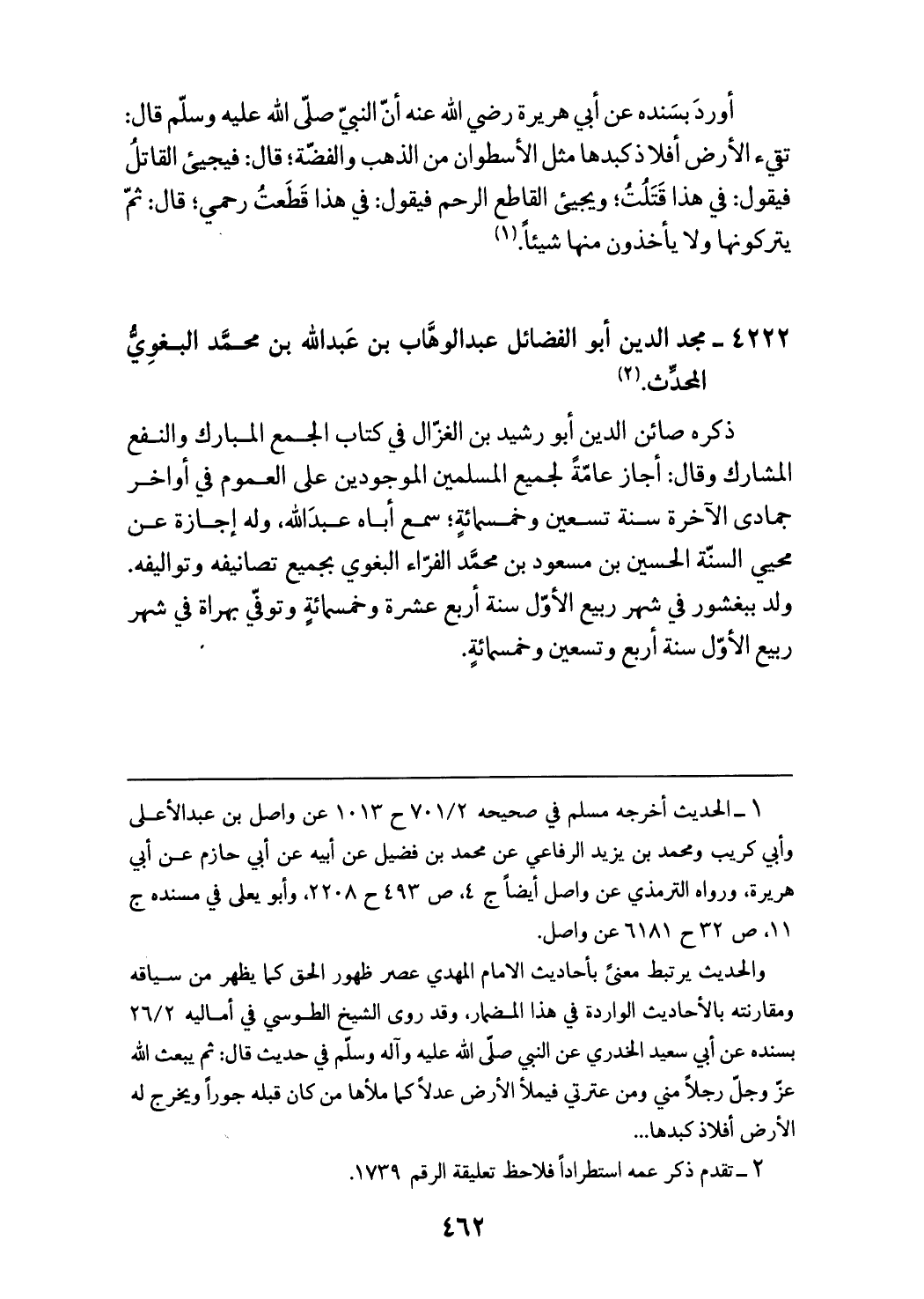 (¬1) الحديث أخرجه مسلم في صحيحه 701/ 2 ح 1013 عن واصل بن عبد الأعلى وأبي كريب ومحمد بن يزيد الرفاعي عن محمد بن فضيل عن أبيه عن أبي حازم عن أبي هريرة، ورواه الترمذي عن واصل أيضا ج 4، ص 493 ح 2208، وأبو يعلى في مسنده ج 11، ص 32 ح 6181 عن واصل. والحديث يرتبط معنى بأحاديث الامام المهدي عصر ظهور الحق كما يظهر من سياقه ومقارنته بالأحاديث الواردة في هذا المضمار، وقد روى الشيخ الطوسي في أماليه 26/ 2 بسنده عن أبي سعيد الخدري عن النبي صلّى الله عليه وآله وسلّم في حديث قال: ثم يبعث الله عزّ وجلّ رجلا مني ومن عترتي فيملأ الأرض عدلا كما ملأها من كان قبله جورا ويخرج له الأرض أفلاذ كبدها