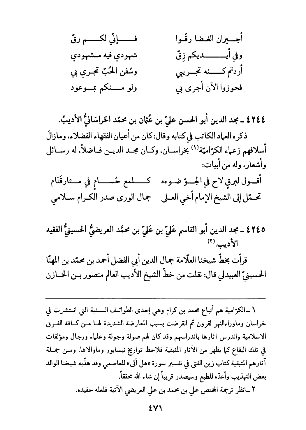 (¬1) الكرّامية هم أتباع محمد بن كرام وهي إحدى الطوائف السنية التي انتشرت في خراسان وما وراء النهر لقرون ثم انقرضت بسبب المعارضة الشديدة لها من كافة الفرق الاسلامية واندرس آثارها باندراسهم وقد كان لهم صولة وجولة وعلماء ورجال ومؤلفات في تلك البقاع كما يظهر من الآثار المثبقية فلاحظ تواريخ نيسابور وماوالاها. ومن جملة آثارهم المتبقية كتاب زين الفتى في تفسير سورة «هل أتى» للعاصمي وقد هذّبه شيخنا الوالد بعض التهذيب وأعدّه للطبع وسيصدر قريبا إن شاء الله محققا.