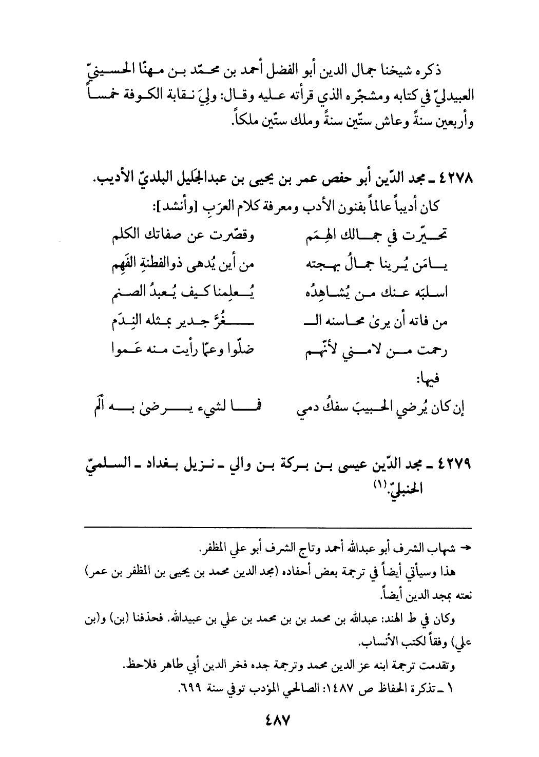 4279 - مجد الدّين عيسى بن بركة بن والي - نزيل بغداد - السلميّ الحنبليّ. (¬1)