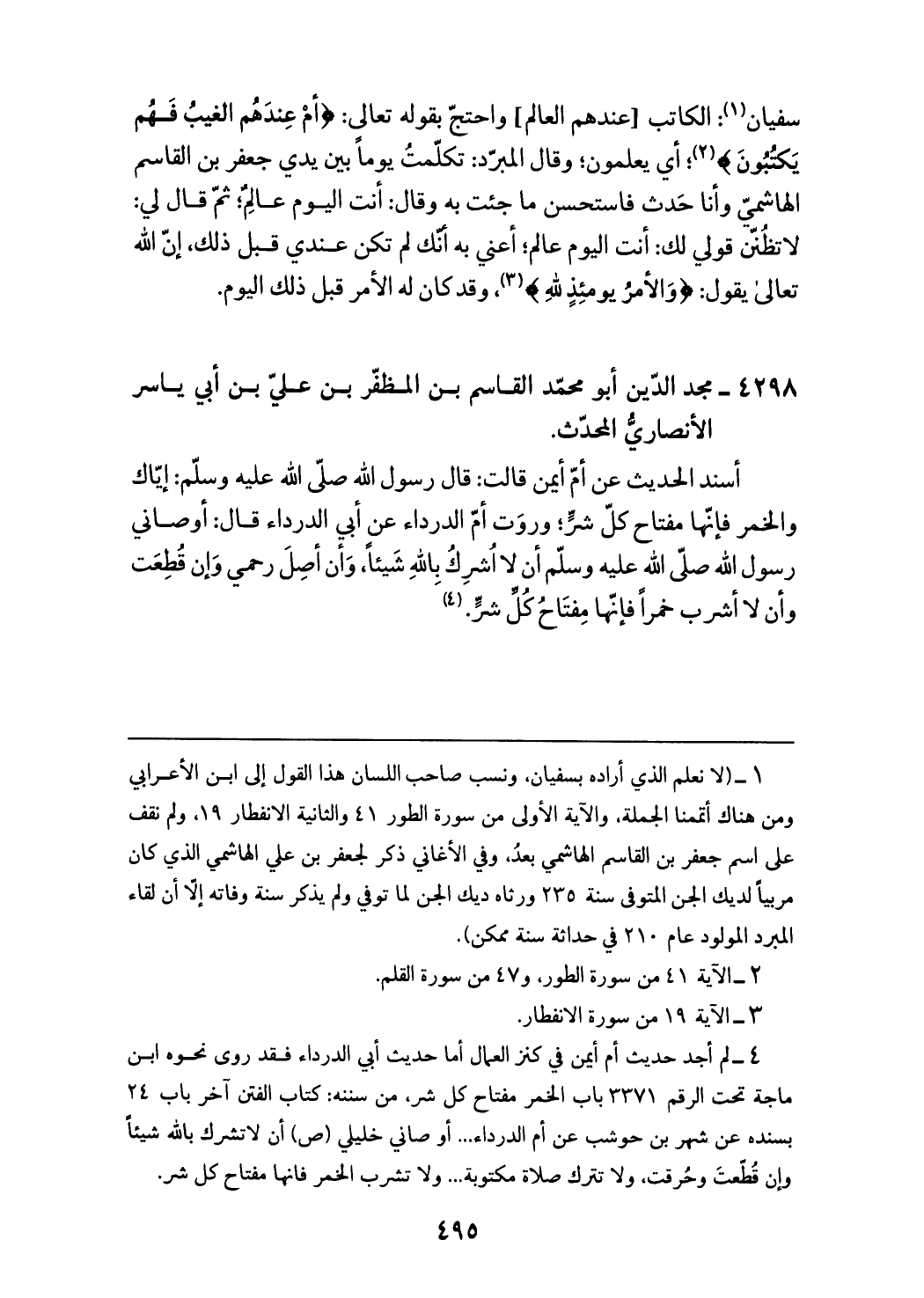 (¬1) (لا نعلم الذي أراده بسفيان، ونسب صاحب اللسان هذا القول إلى ابن الأعرابي ومن هناك أتممنا الجملة، والآية الأولى من سورة الطور 41 والثانية الانفطار 19، ولم نقف على اسم جعفر بن القاسم الهاشمي بعد، وفي الأغاني ذكر لجعفر بن علي الهاشمي الذي كان مربيا لديك الجن المتوفى سنة 235 ورثاه ديك الجن لما توفي ولم يذكر سنة وفاته إلاّ أن لقاء المبرد المولود عام 210 في حداثة سنة ممكن).