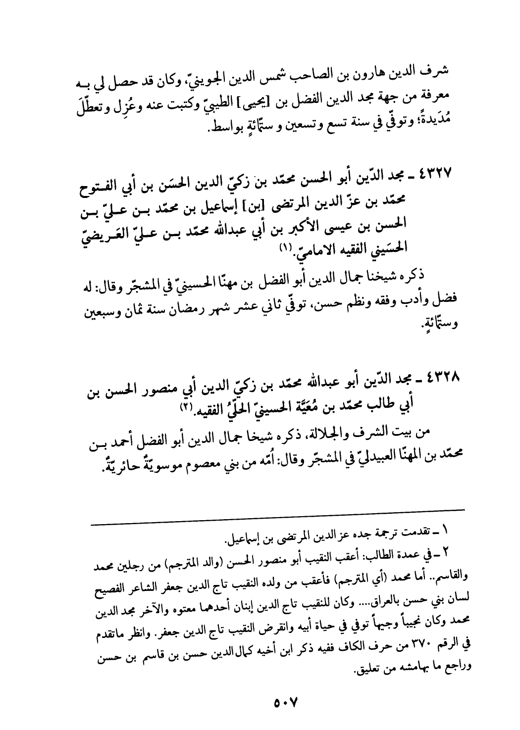 (¬2) في عمدة الطالب: أعقب النقيب أبو منصور الحسن (والد المترجم) من رجلين محمد والقاسم .. أما محمد (أي المترجم) فأعقب من ولده النقيب تاج الدين جعفر الشاعر الفصيح لسان بني حسن بالعراق ... وكان للنقيب تاج الدين ابنان أحدهما معتوه والآخر مجد الدين محمد وكان نجيبا وجيها توفي في حياة أبيه وانقرض النقيب تاج الدين جعفر. وانظر ما تقدم في الرقم 370 من حرف الكاف ففيه ذكر ابن أخيه كمال الدين حسن بن قاسم بن حسن وراجع ما بهامشه من تعليق.