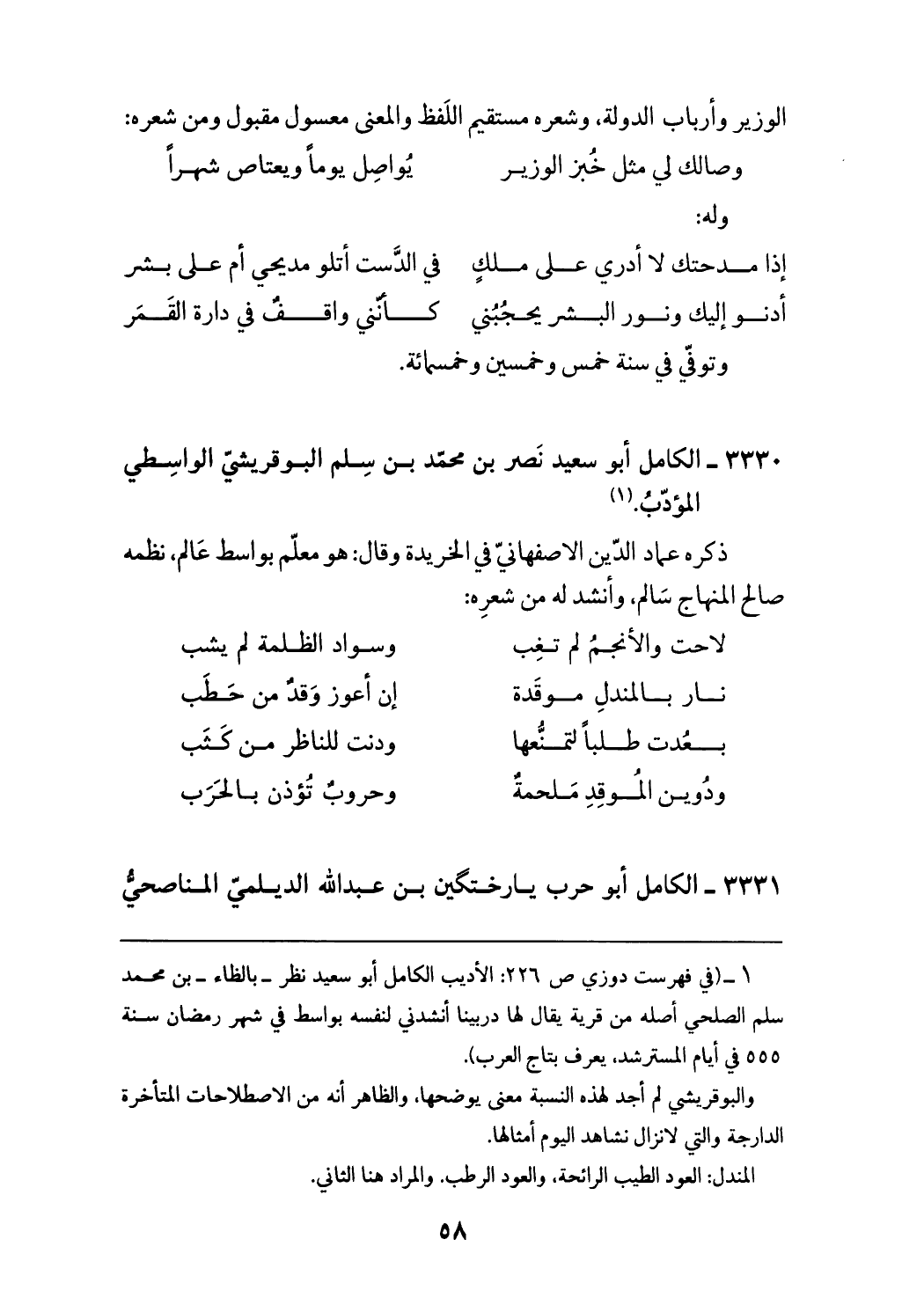 (¬1) (في فهرست دوزي ص 226: الأديب الكامل أبو سعيد نظر - بالظاء - بن محمد سلم الصلحي أصله من قرية يقال لها دربينا أنشدني لنفسه بواسط في شهر رمضان سنة 555 في أيام المسترشد، يعرف بتاج العرب). والبوقريشي لم أجد لهذه النسبة معنى يوضحها، والظاهر أنه من الاصطلاحات المتأخرة الدارجة والتي لا نزال نشاهد اليوم أمثالها. المندل: العود الطيب الرائحة، والعود الرطب. والمراد هنا الثاني.