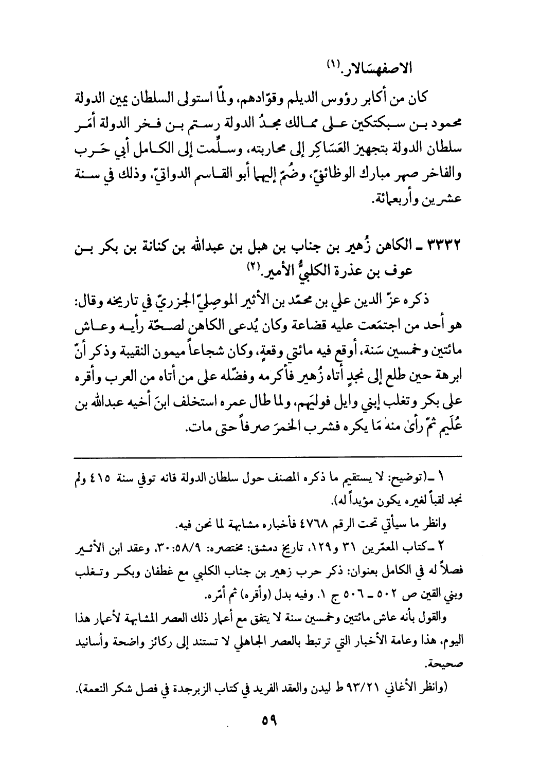 (¬2) كتاب المعمّرين 31 و 129، تاريخ دمشق: مختصره: 58/ 9: 30، وعقد ابن الأثير فصلا له في الكامل بعنوان: ذكر حرب زهير بن جناب الكلبي مع غطفان وبكر وتغلب وبني القين ص 502 - 506 ج 1.وفيه بدل (وأقره) ثم أمّره. والقول بأنه عاش مائتين وخمسين سنة لا يتفق مع أعمار ذلك العصر المشابهة لأعمار هذا اليوم، هذا وعامة الأخبار التي ترتبط بالعصر الجاهلي لا تستند إلى ركائز واضحة وأسانيد صحيحة. (وانظر الأغاني 93/ 21 ط ليدن والعقد الفريد في كتاب الزبرجدة في فصل شكر النعمة).