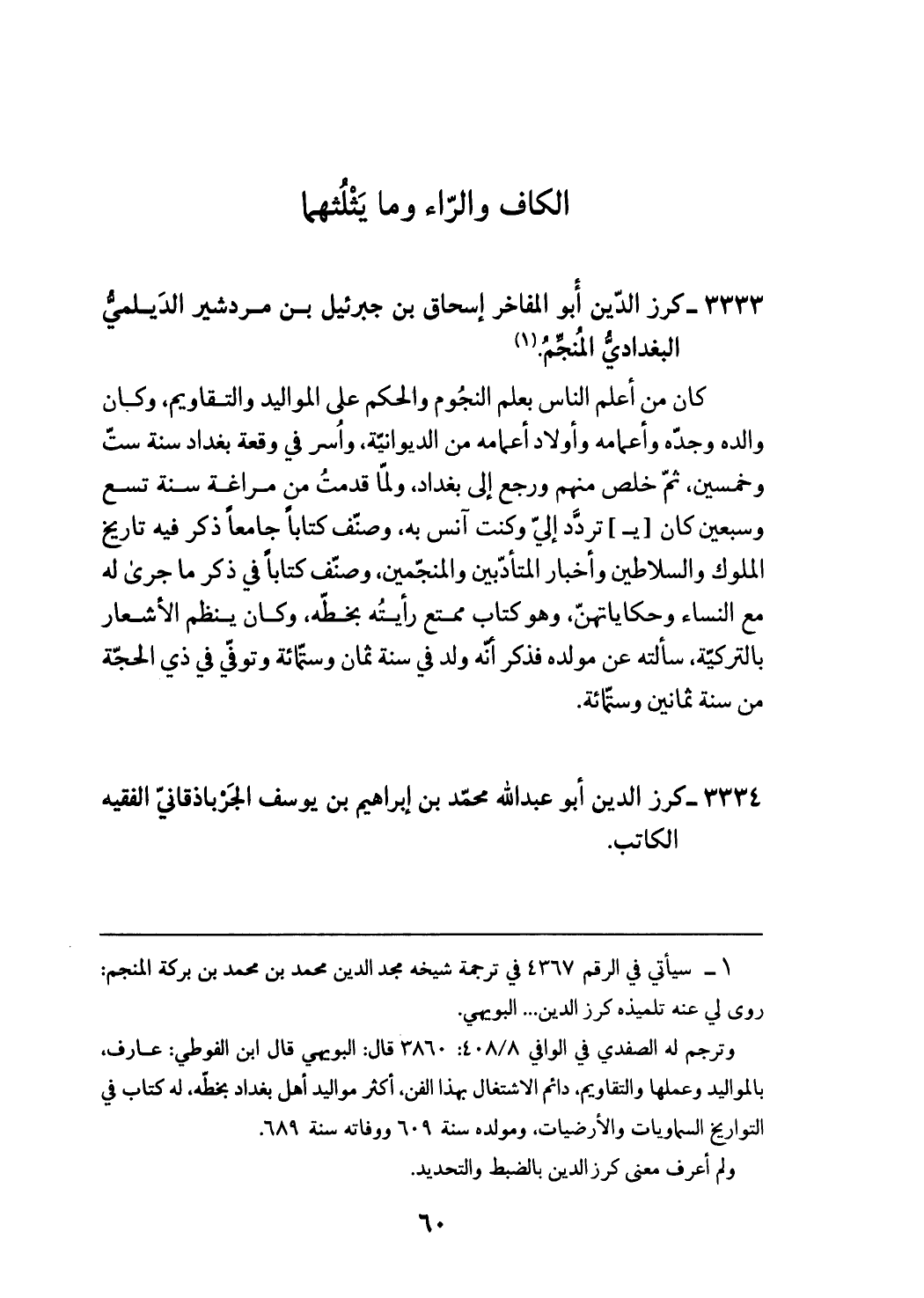 (¬1) سيأتي في الرقم 4367 في ترجمة شيخه مجد الدين محمد بن محمد بن بركة المنجم: روى لي عنه تلميذه كرز الدين ... البويهي. وترجم له الصفدي في الوافي 408/ 8: 3860 قال: البويهي قال ابن الفوطي: عارف، بالمواليد وعملها والتقاويم، دائم الاشتغال بهذا الفن، أكثر مواليد أهل بغداد بخطّه، له كتاب في التواريخ السماويات والأرضيات، ومولده سنة 609 ووفاته سنة 689. ولم أعرف معنى كرز الدين بالضبط والتحديد.