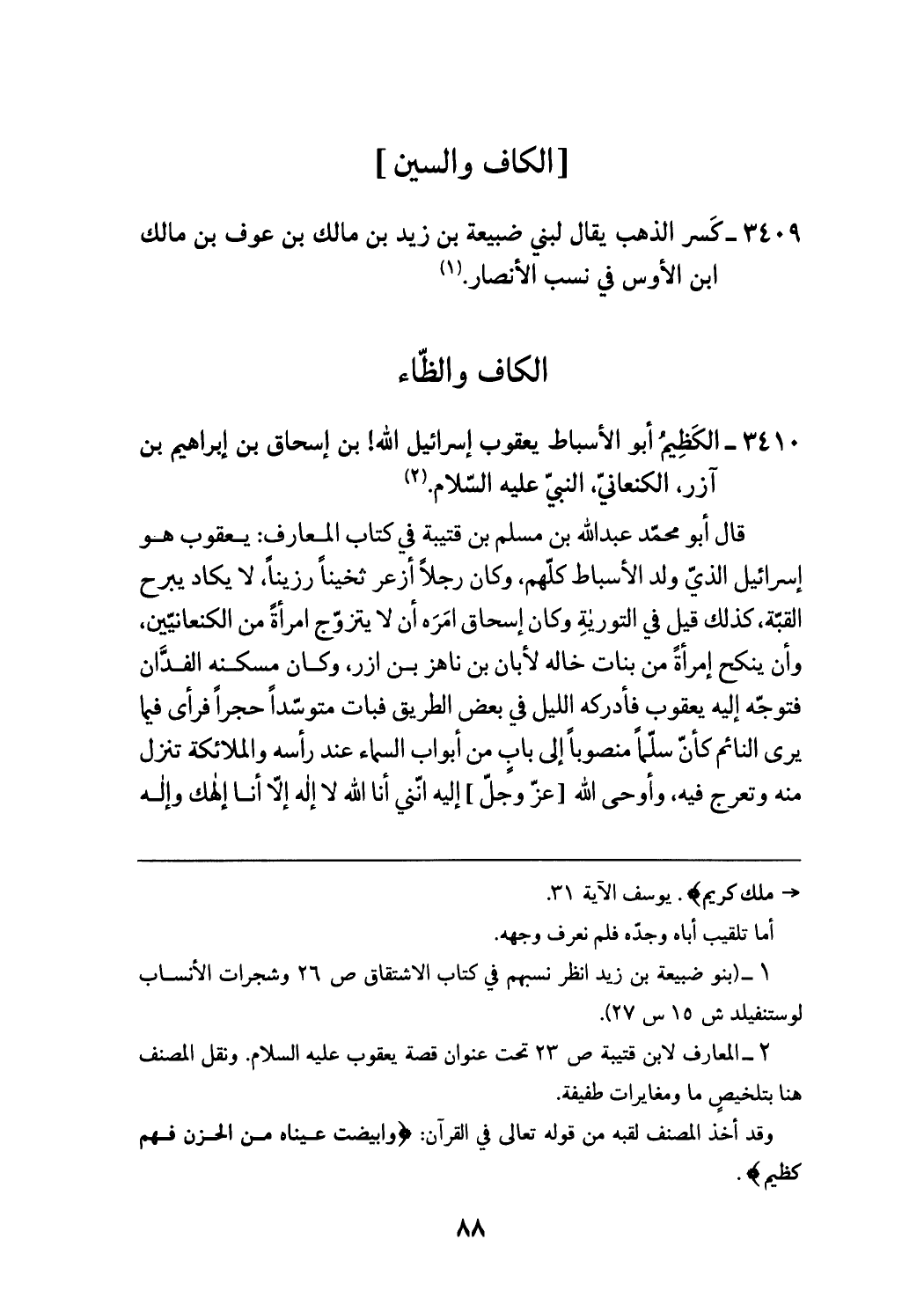 (¬2) المعارف لابن قتيبة ص 23 تحت عنوان قصة يعقوب عليه السلام. ونقل المصنف هنا بتلخيص ما ومغايرات طفيفة. وقد أخذ المصنف لقبه من قوله تعالى في القرآن: وَابْيَضَّتْ عَيْناهُ مِنَ الْحُزْنِ فَهُوَ كَظِيمٌ.