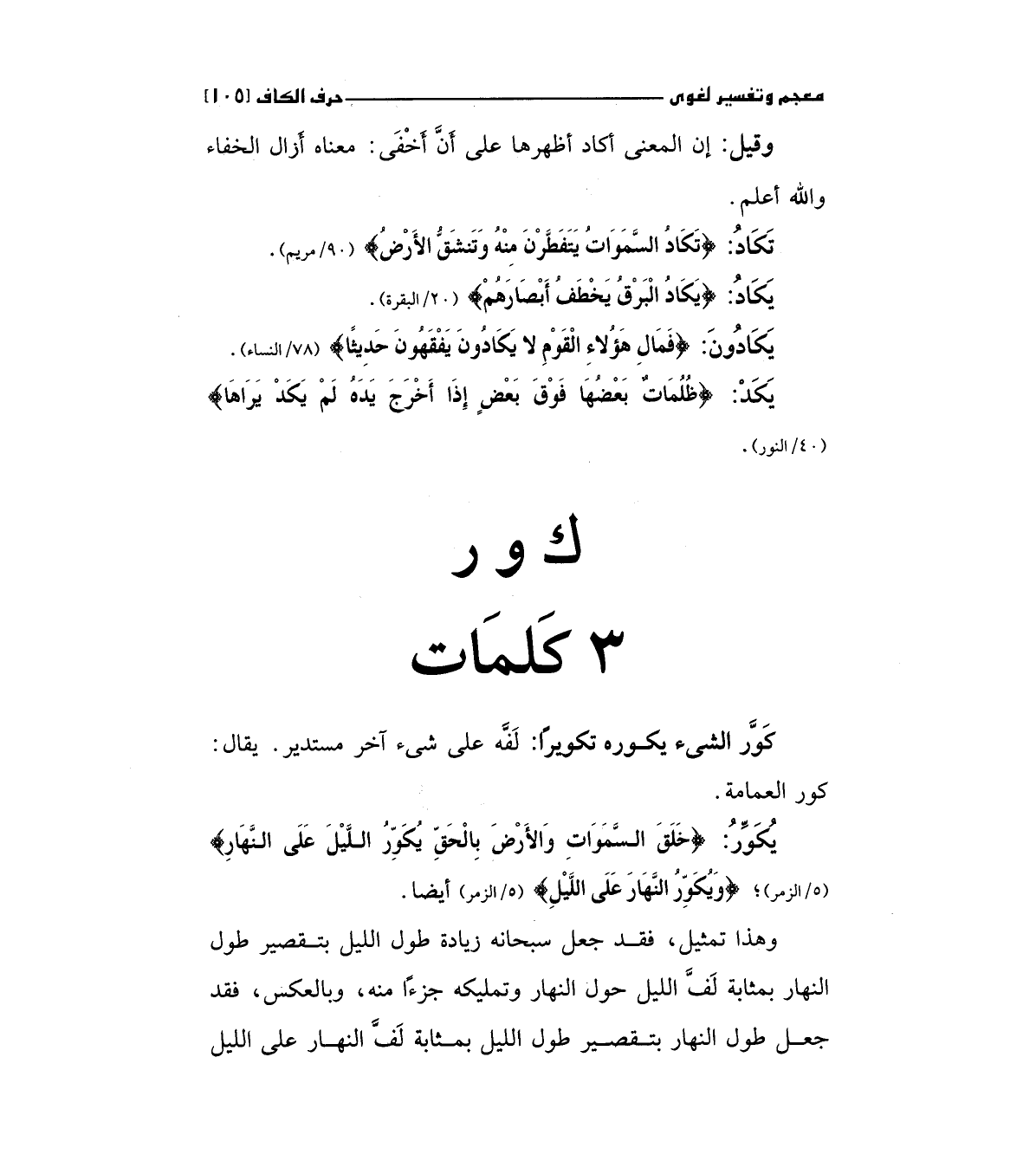 يكور: (خَلَقَ السَّمَوَاتِ وَالأَرْضَ بِالْحَقِّ يُكَوِّرُ اللَّيْلَ عَلَى النَّهَارِ) " 5/الزمر" (وَيُكَوِّرُ النَّهَارَ عَلَى اللَّيْلِ) " 5/الزمر" أيضا.