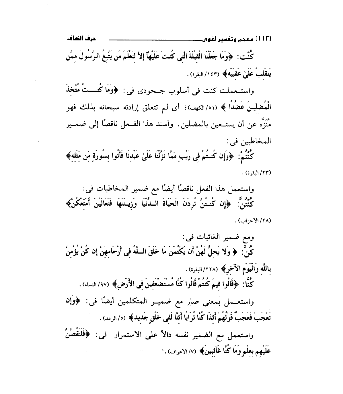 واستعملت كنت في أسلوب جحودي في: (وَمَا كُنتُ مُتَّخِذَ الْمُضِلِّينَ عَضُداً) " 51/الكهف" أي لم تتعلق إرادته سبحانه بذلك فهو منزه عن أن يستعين بالمضلين. وأسند هذا الفعل ناقصا إلي ضمير المخاطبين في: