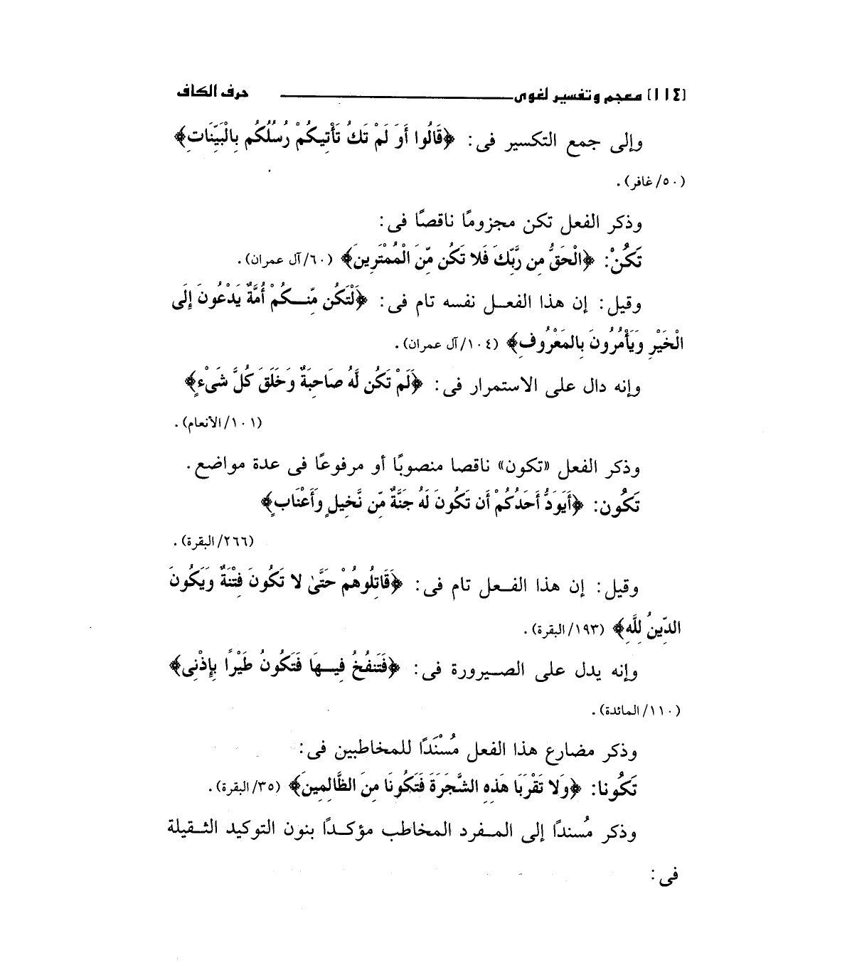 وذكر الفعل" تكون" ناقصا منصوبا أو مرفوعا في عدة مواضع.