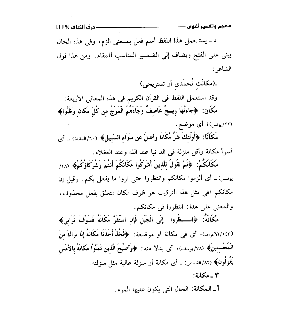مكانكم:" ثُمَّ نَقُولُ لِلَّذِينَ أَشْرَكُوا مَكَانَكُمْ أَنْتُمْ وَشُرَكَاؤُكُمْ " " 28/يونس". أي ألزموا مكانكم وانتظروا حتي تروا ما يفعل بكم وقيل إن مكانكم " في مثل هذا التركيب هو ظرف مكان متعلق بفعل محذوف والمعني علي هذا: انتظروا في مكانكم.
