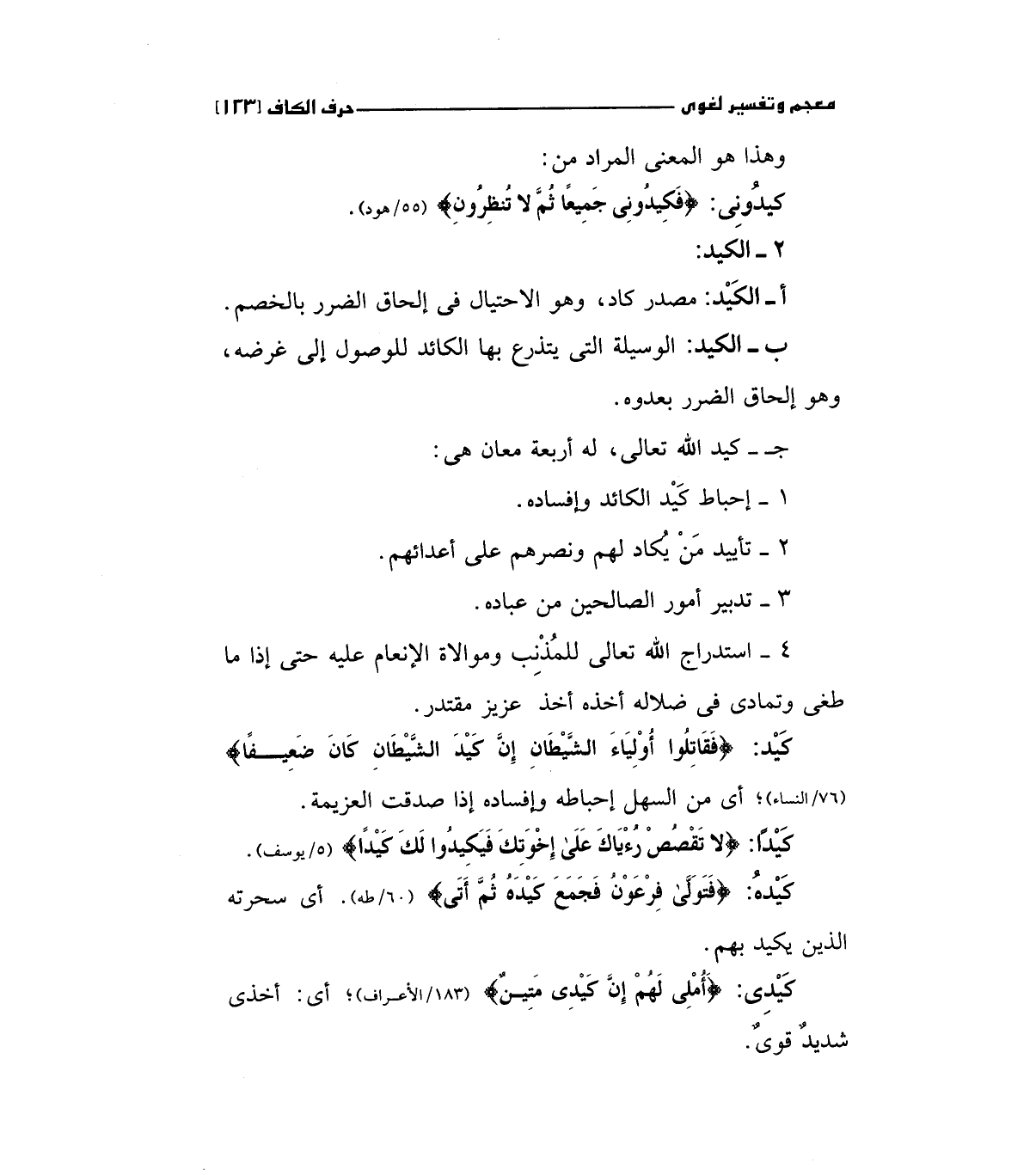 كيد: (فَقَاتِلُوا أَوْلِيَاءَ الشَّيْطَانِ إِنَّ كَيْدَ الشَّيْطَانِ كَانَ ضَعِيفاً) " 76/النساء" أي من السهل إحباطه وإفساده إذا صدقت العزيمة.