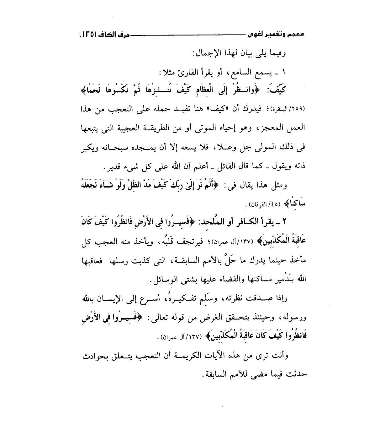 كيف: (وَانظُرْ إِلَى الْعِظَامِ كَيْفَ نُنشِزُهَا ثُمَّ نَكْسُوهَا لَحْماً) " 259/البقرة " فيدرك أن كيف هنا تفيد حمله علي التعجيب من هذا العمل المعجز، وهو إحياء الموتي أو من الطريقة العجيبة التي يتبعها في ذلك المولي جل وعلا، فلا يسعه إلا أن يمجده سبحانه ويكبر ذاته ويقول - كما قال القائل - أعلم أن الله علي كل شئ قدير.
