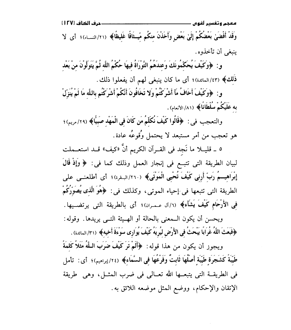 5 - قليلا ما نجد في القرآن الكريم " كيف " قد استعملت لبيان الطريقة التي تتبع في إنجاز العمل وذلك كما في: (وَإِذْ قَالَ إِبْرَاهِيمُ رَبِّ ارني كَيْفَ تُحْيِ الْمَوْتَى) " 260/البقرة" أي أطلعني علي الطريقة التي تتبعها في إحياء الموتي، وكذلك في: (هُوَ الَّذِي يُصَوِّرُكُمْ فِي الأَرْحَامِ كَيْفَ يَشَاءُ) "6/آل عمران" أي بالطريقة التي يرتضيها ويحسن أن يكون المعني بالحالة أو الهيئة التي يريدها وقوله: (فَبَعَثَ اللَّهُ غُرَاباً يَبْحَثُ فِي الأَرْضِ لِيُرِيَهُ كَيْفَ يُوَارِي سَوْأَةَ أَخِيهِ) " 31/المائدة "
