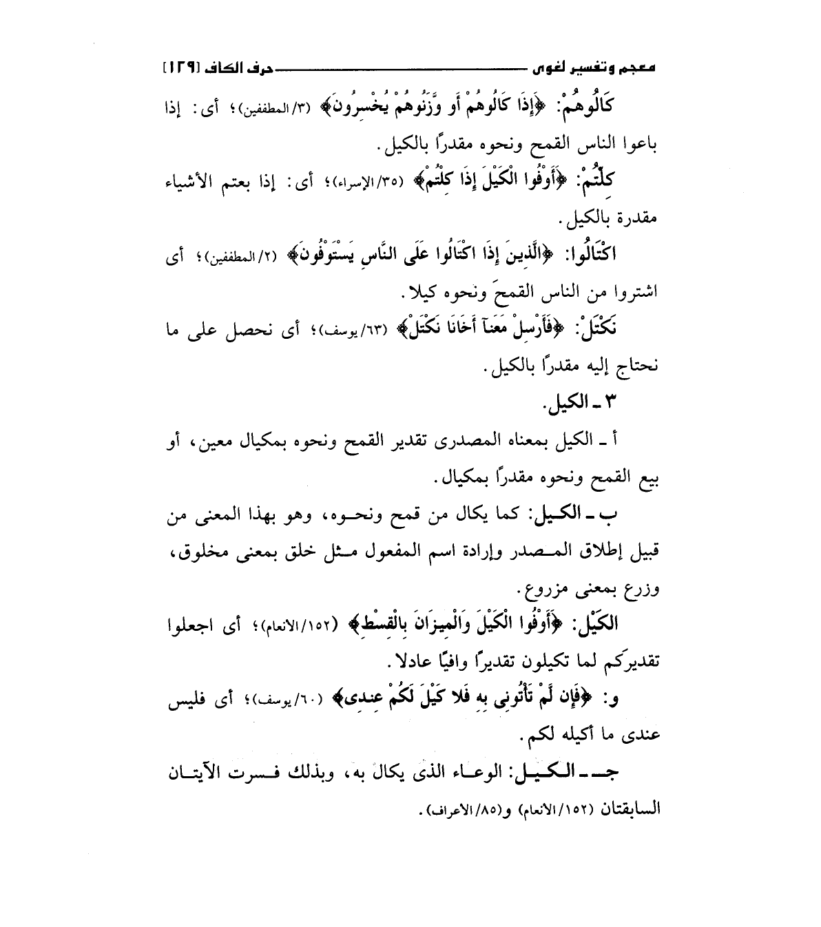 ج- الكيل: الوعاء الذي يكال به، وبذلك فسرت الآيتان السابقتان (152/الأنعام) و (85/الأعراف).