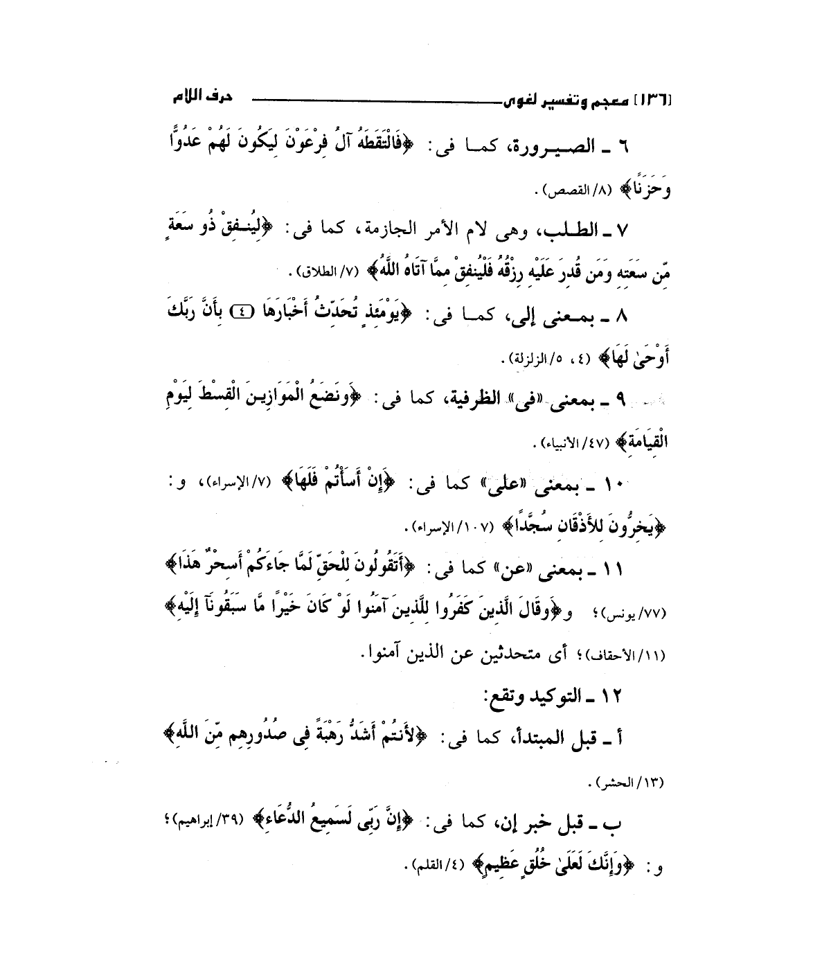 8 - بمعني"علي" كما في: (وَإِنْ أَسَأْتُمْ فَلَهَا) "7/الإسراء"و: (يَخِرُّونَ لِلأَذْقَانِ سُجَّداً) "107/الإسراء".