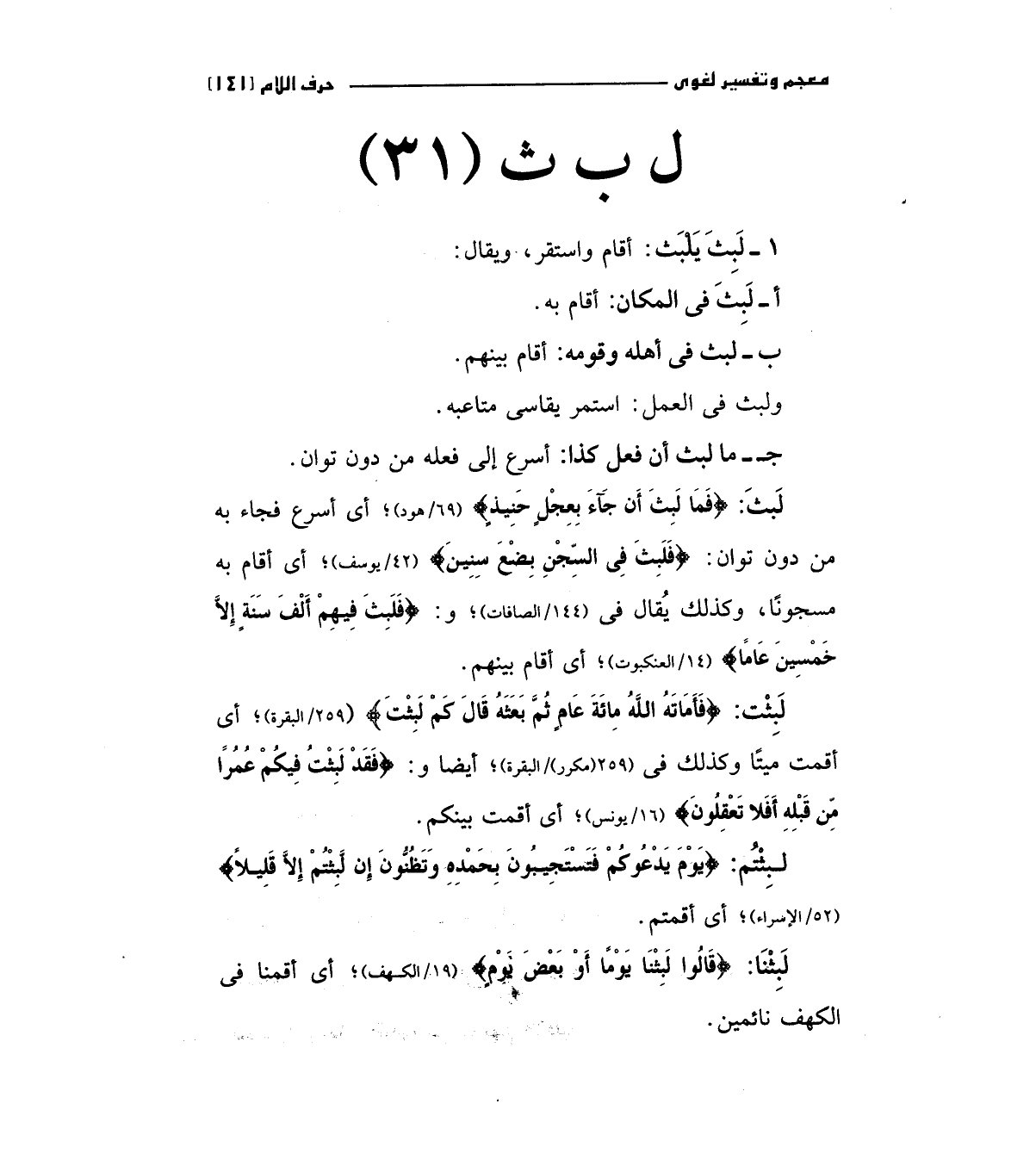 لبث: (فَمَا لَبِثَ أَنْ جَاءَ بِعِجْلٍ حَنِيذٍ) " 69/هود " أي أسرع فجاء به من دون توان: (فَلَبِثَ فِي السِّجْنِ بِضْعَ سِنِينَ) " 42/يوسف " أي أقام به مسجونا، وكذلك يقال في "144/الصافات " و: (فَلَبِثَ فِيهِمْ أَلْفَ سَنَةٍ إِلاَّ خَمْسِينَ عَاماً) " 14/العنكبوت " أي أقام بينهم.