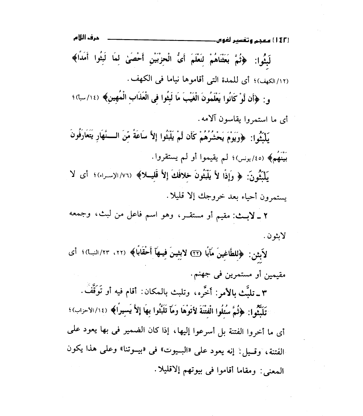 لبثوا: (ثُمَّ بَعَثْنَاهُمْ لِنَعْلَمَ أَيُّ الْحِزْبَيْنِ أَحْصَى لِمَا لَبِثُوا أَمَداً) "12/الكهف" أي للمدة التي أقاموها نياما في الكهف.