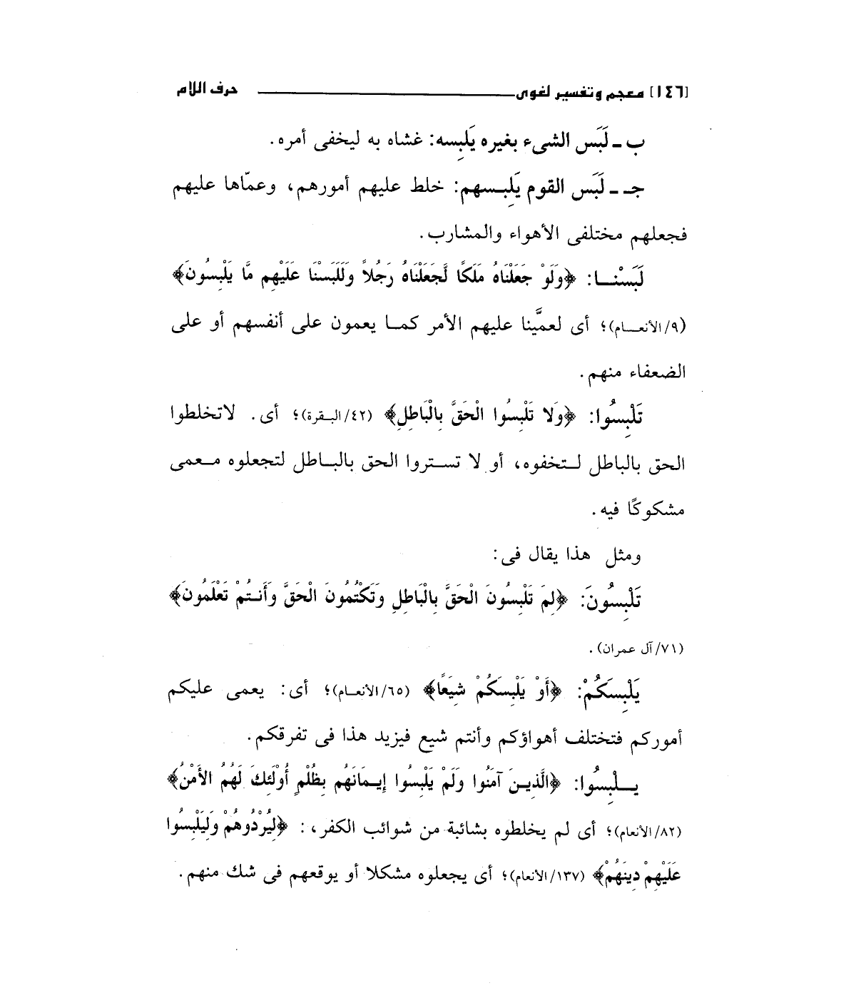 يلبسوا: (الَّذِينَ آمَنُوا وَلَمْ يَلْبِسُوا إِيمَانَهُمْ بِظُلْمٍ أُوْلَئِكَ لَهُمْ الأَمْنُ) " 82/الأنعام " أي لم يخلطوه بشائبة من شوائب الكفر، (لِيُرْدُوهُمْ وَلِيَلْبِسُوا عَلَيْهِمْ دِينَهُمْ) "137/الأنعام" أي يجعلوه مشكلا أو يوقعهم في شك منهم.