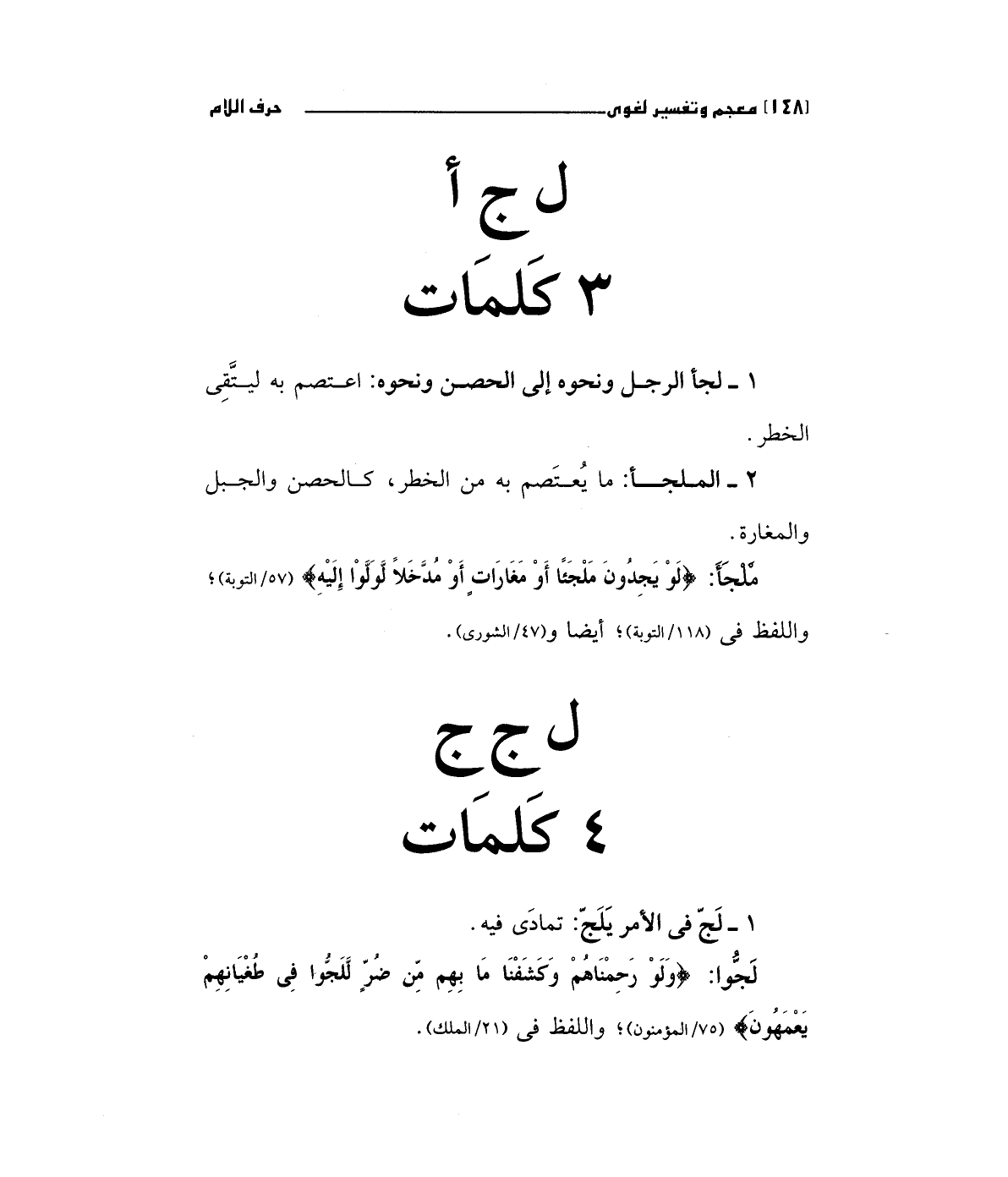 ملجأ: (لَوْ يَجِدُونَ مَلْجَأً أَوْ مَغَارَاتٍ أَوْ مُدَّخَلاً لَوَلَّوْا إِلَيْهِ) " 57/التوبة " واللفظ في "118/ التوبة " أيضا و"47/الشوري".