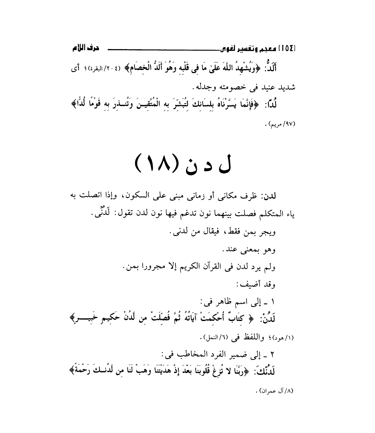 لدن: (كِتَابٌ أُحْكِمَتْ آيَاتُهُ ثُمَّ فُصِّلَتْ مِنْ لَدُنْ حَكِيمٍ خَبِيرٍ) " 1/هود" واللفظ في " 6/النمل ".