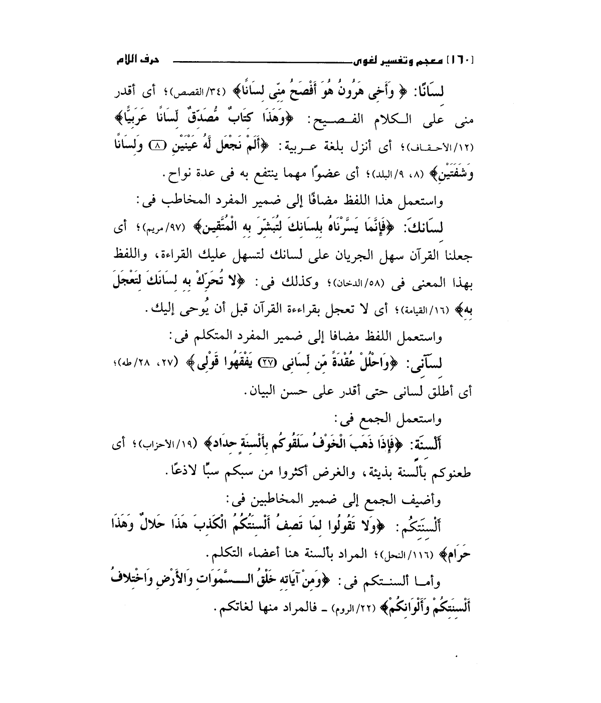 1. لسانا: (وَأَخِي هَارُونُ هُوَ أَفْصَحُ مِنِّي لِسَاناً) " 34/القصص" أي قدر مني علي الكلام الفصيح: (وَهَذَا كِتَابٌ مُصَدِّقٌ لِسَاناً عَرَبِيّاً) " 12/الأحقاف " أي أنزل بلغة عربية: (أَلَمْ نَجْعَل لَّهُ عَيْنَيْنِ