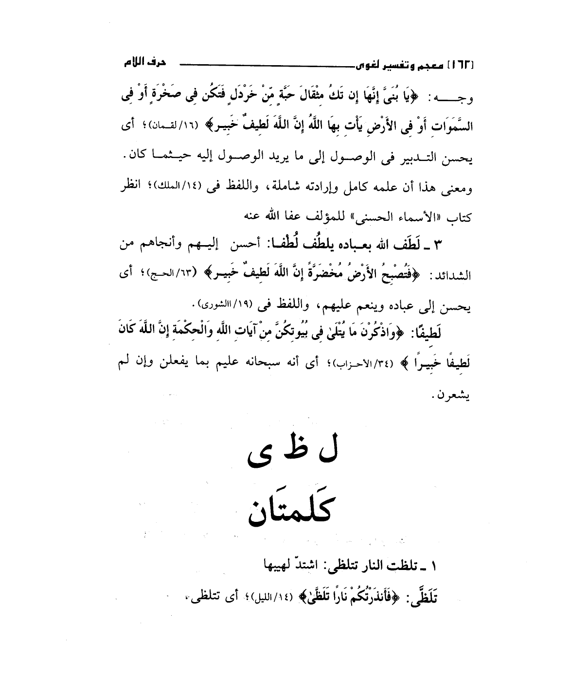 وجه: (يَا بُنَيَّ إِنَّهَا إِنْ تَكُ مِثْقَالَ حَبَّةٍ مِنْ خَرْدَلٍ فَتَكُنْ فِي صَخْرَةٍ أَوْ فِي السَّمَوَاتِ أَوْ فِي الأَرْضِ يَأْتِ بِهَا اللَّهُ إِنَّ اللَّهَ لَطِيفٌ خَبِيرٌ) "16/لقمان " أي يحسن التدبير في الوصول إلي ما يريد الوصول إليه حيثما كان ومعني هذا أن عمله كامل وإرادته شاملة، واللفظ في " 14/الملك " انظر كتاب " الأسماء الحسني " للمؤلف عفا الله عنه.