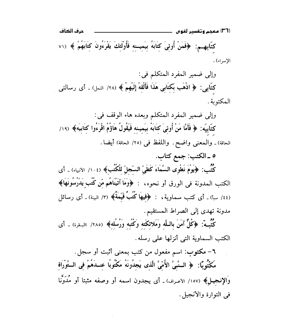 كتب: (يَوْمَ نَطْوِي السَّمَاءَ كَطَيِّ السِّجِلِّ لِلْكُتُبِ) " 104/الأنبياء " أي الكتب المدونة في الورق أو نحوه،: (وَمَا آتَيْنَاهُمْ مِنْ كُتُبٍ يَدْرُسُونَهَا) " 44/سبأ " أي كتب سماوية، (فِيهَا كُتُبٌ قَيِّمَةٌ) " 3/البينة " أي رسائل مدونة تهدي إلي الصراط المستقيم.