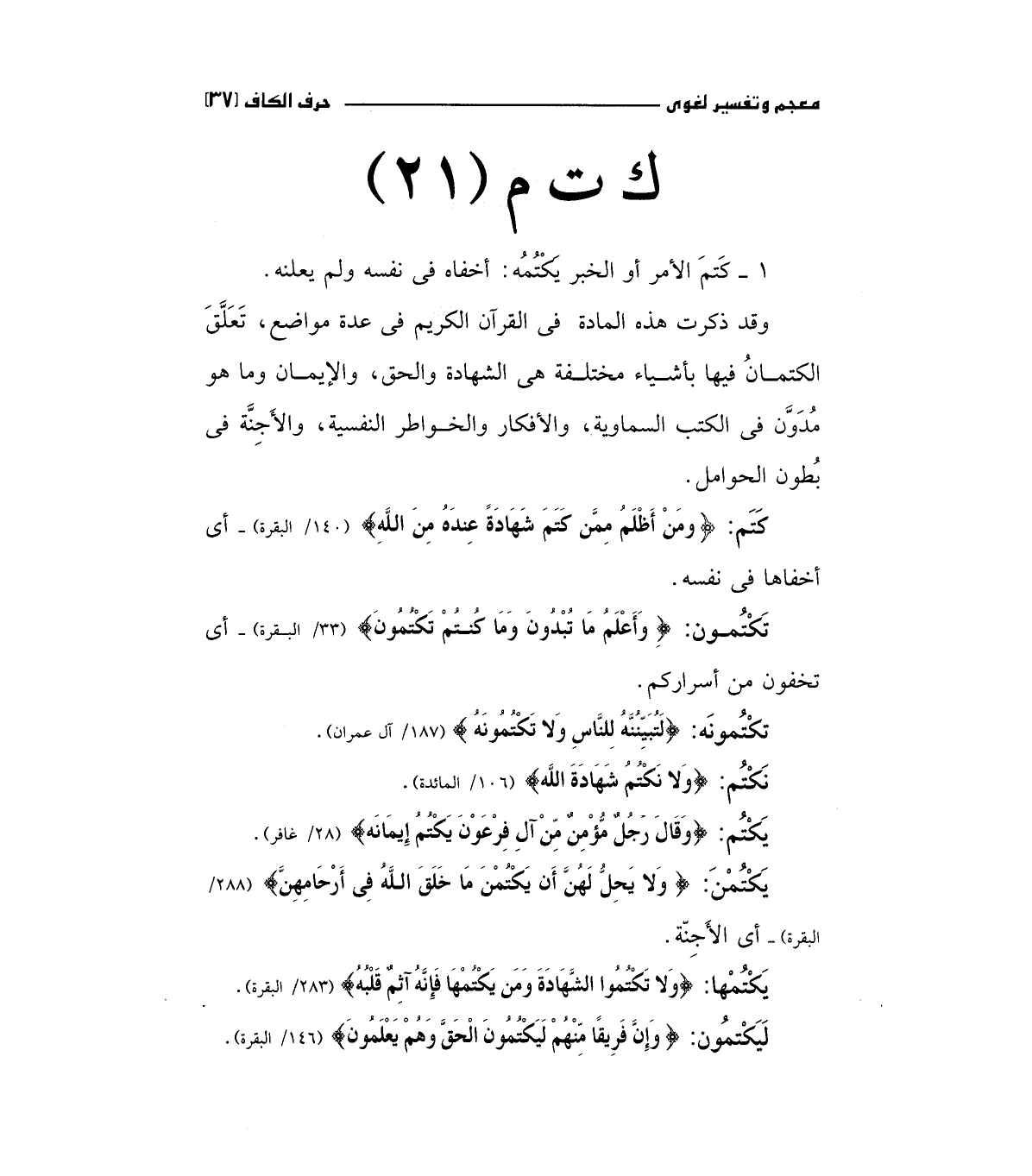 كتم: (وَمَنْ أَظْلَمُ مِمَّنْ كَتَمَ شَهَادَةً عِنْدَهُ مِنْ اللَّهِ) " 140/البقرة " أي أخفاها في نفسه.