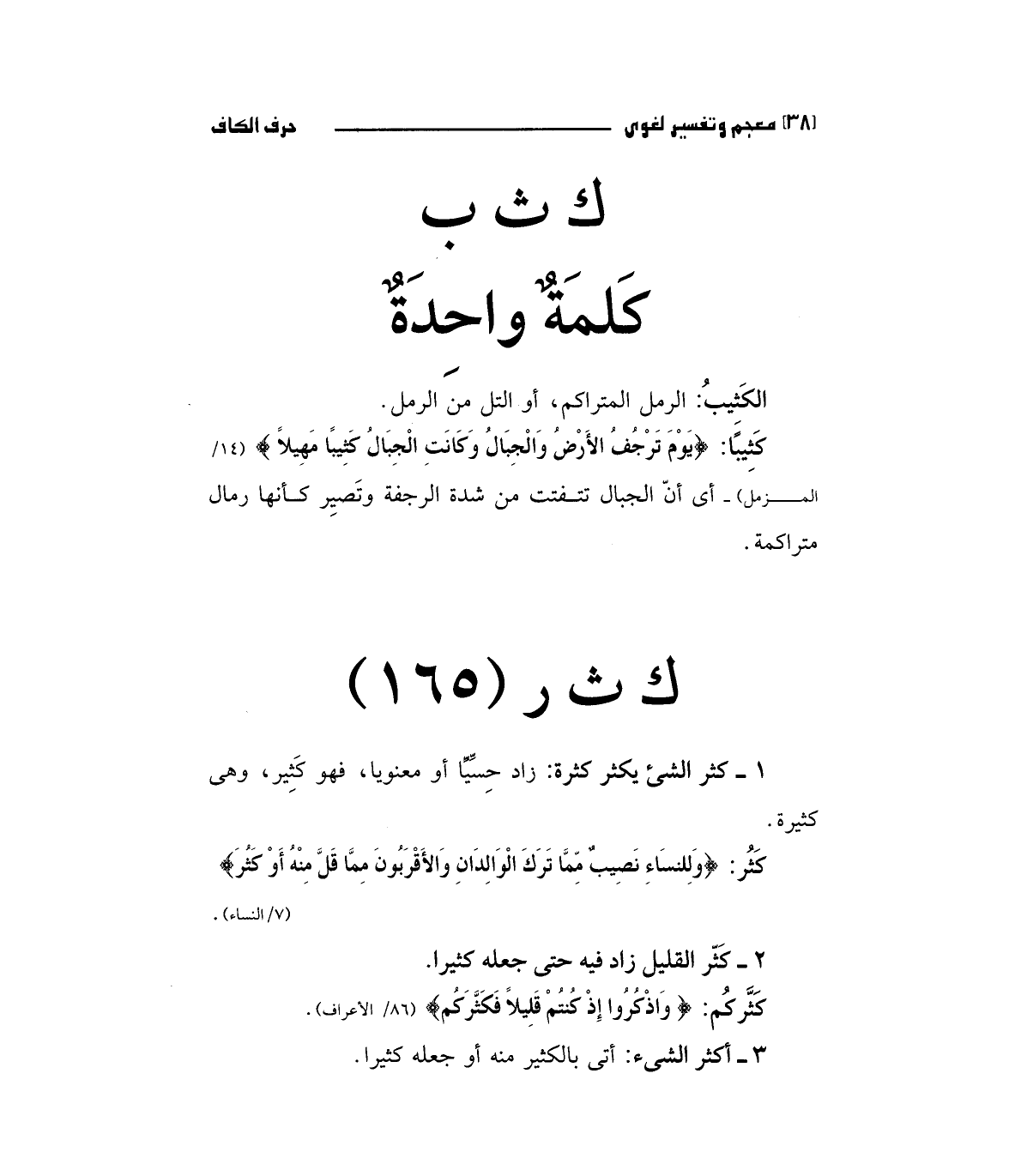 كثيبا: (يَوْمَ تَرْجُفُ الأَرْضُ وَالْجِبَالُ وَكَانَتْ الْجِبَالُ كَثِيباً مَهِيلاً) " 14/المزمل " أي ان الجبال تتفتت من شدة الرجفة وتصير كأنها رمال متراكمة.