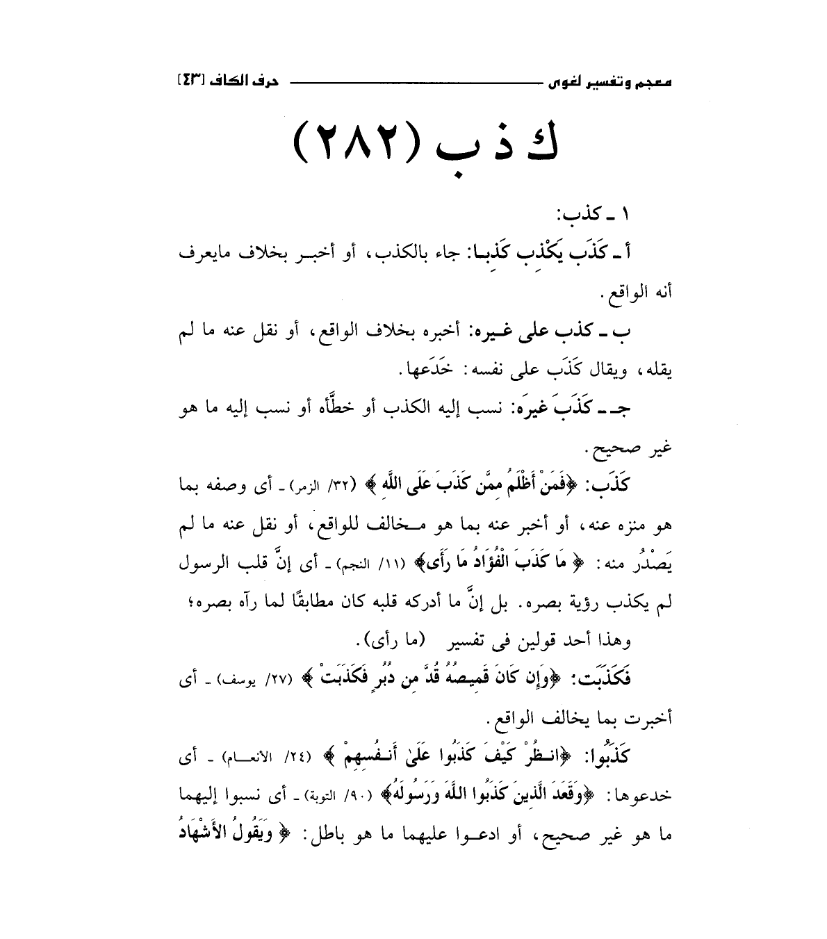كذب: (فَمَنْ أَظْلَمُ مِمَّنْ كَذَبَ عَلَى اللَّهِ) " 32/الزمر " أي وصفه بما هو منزه عنه، أو أخبر عنه بما هو مخالف للواقع، أو نقل عنه ما لم يصدر منه: (مَا كَذَبَ الْفُؤَادُ مَا رَأَى) " 11/النجم " أي أن قلب الرسول لم يكذب رؤية بصره. بل إن ما أدركه قلبه كان مطابقا لما رآه بصره، وهذا أحد قولين في تفسير (ما رأي)
