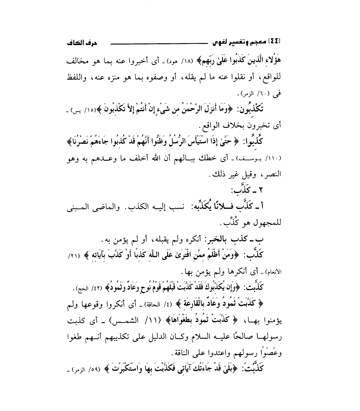 كذب: (وَمَنْ أَظْلَمُ مِمَّنْ افْتَرَى عَلَى اللَّهِ كَذِباً أَوْ كَذَّبَ بِآيَاتِهِ) " 21/الأنعام " أي أنكرها ولم يؤمن بها.