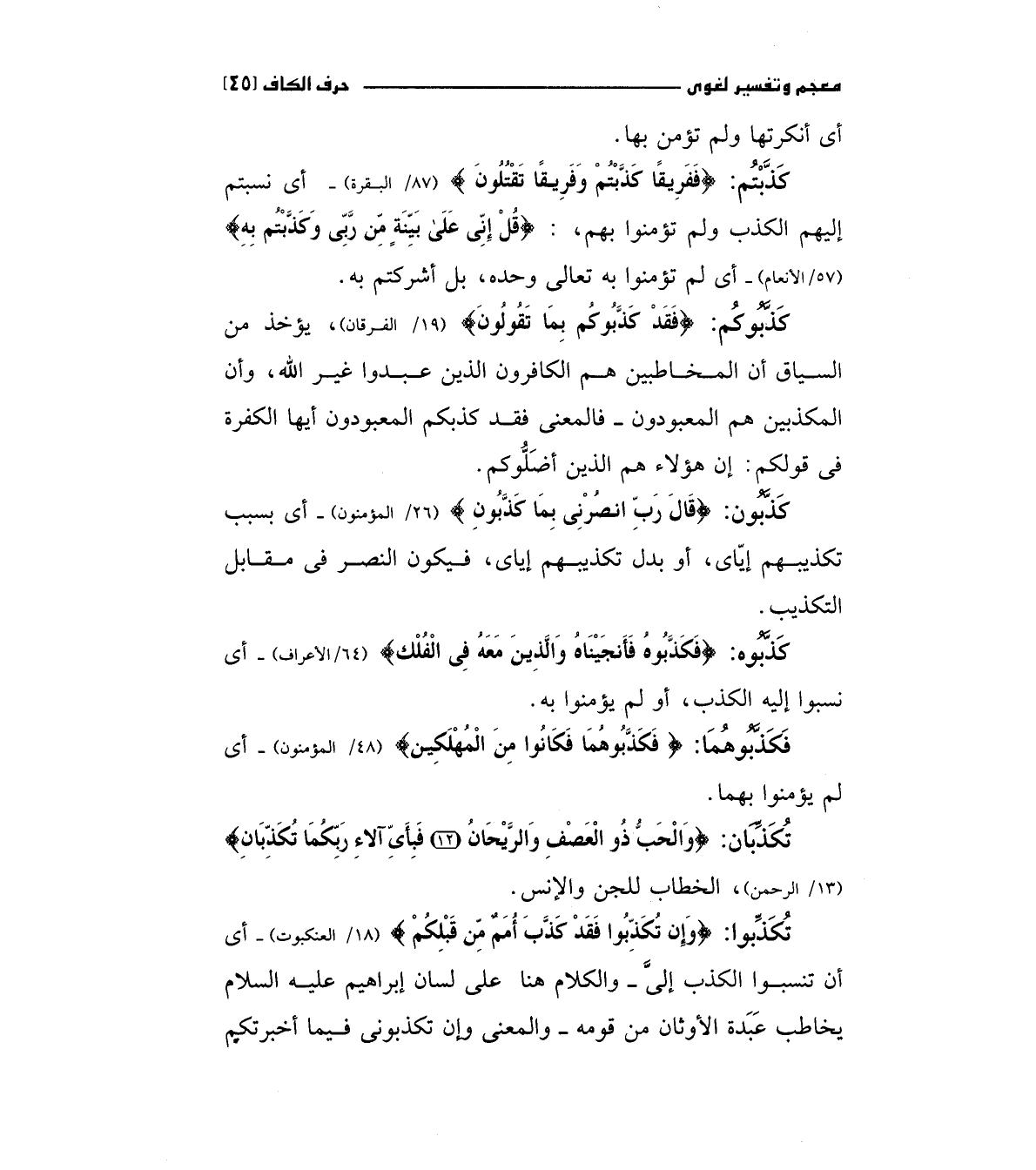 كذبتم: (فَفَرِيقاً كَذَّبْتُمْ وَفَرِيقاً تَقْتُلُونَ) " 87/البقرة " أي نسبتم إليهم الكذب ولم تؤمنوا بهم،: (قُلْ إِنِّي عَلَى بَيِّنَةٍ مِنْ رَبِّي وَكَذَّبْتُمْ بِهِ) " 57/الأنعام " أي لم تؤمنوا به تعالي وحده، بل أشركتم به.