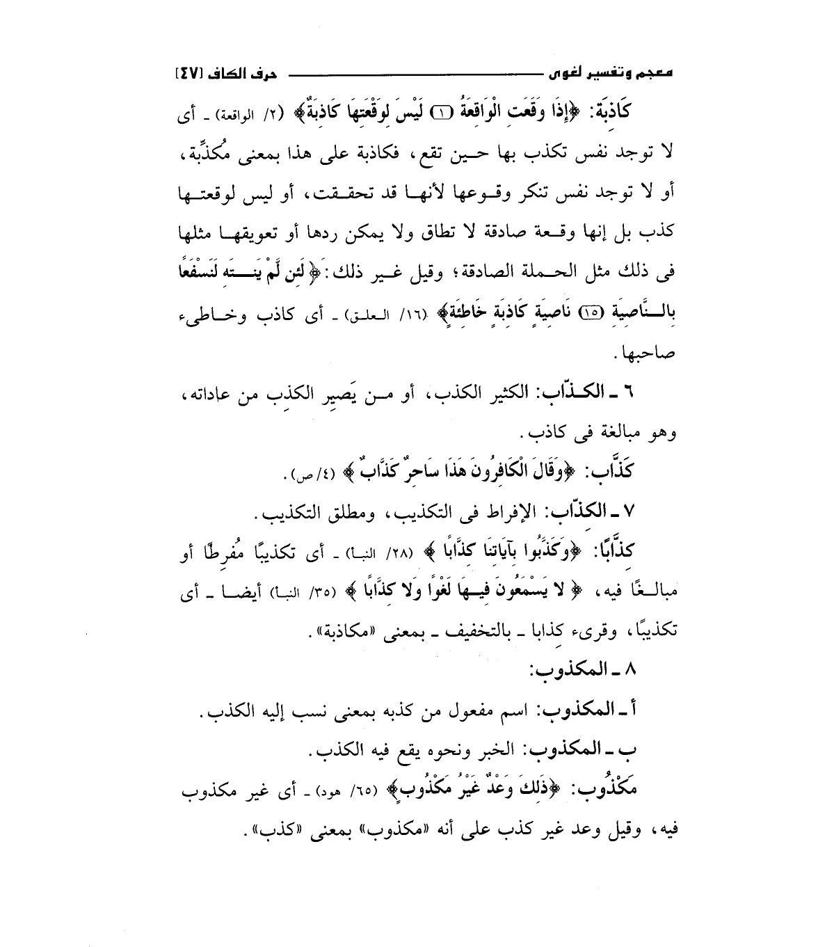 كاذبه: (إِذَا وَقَعَتْ الْوَاقِعَةُ (1) لَيْسَ لِوَقْعَتِهَا كَاذِبَةٌ) " 2/الواقعة " أي لا توجد نفس تكذب بها حين تقع، فكاذبة علي هذا بمعني مكذبة، أو لا توجد نفس تنكر وقوعها لأنها قد تحققت أو ليس لوقعتها كذب بل إنها وقعة صادقة لا تطاق ولا يمكن ردها أو تعويقها مثلها في ذلك مثل الحملة الصادقة وقيل غير ذلك: (لَئِنْ لَمْ يَنْتَهِ لَنَسْفَعَ بِالنَّاصِيَةِ (15) نَاصِيَةٍ كَاذِبَةٍ خَاطِئَةٍ) " 16/العلق " أي كاذب وخاطئ صاحبها.