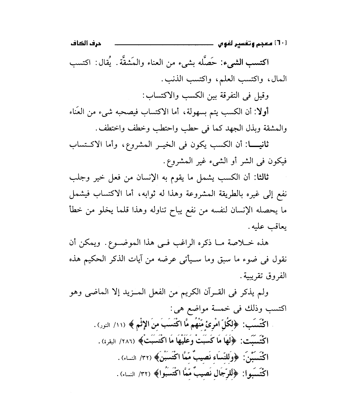ثالثا: أن الكسب يشمل ما يقوم به الإنسان من فعل خير وجلب نفع إلي غيره بالطريقة المشروعية وهذا له ثوابه، أما الاكتساب فيشمل ما يحصله الإنسان لنفسه من نفع يباح تناوله وهذا قلما يخلو من خطا يعاقب عليه.