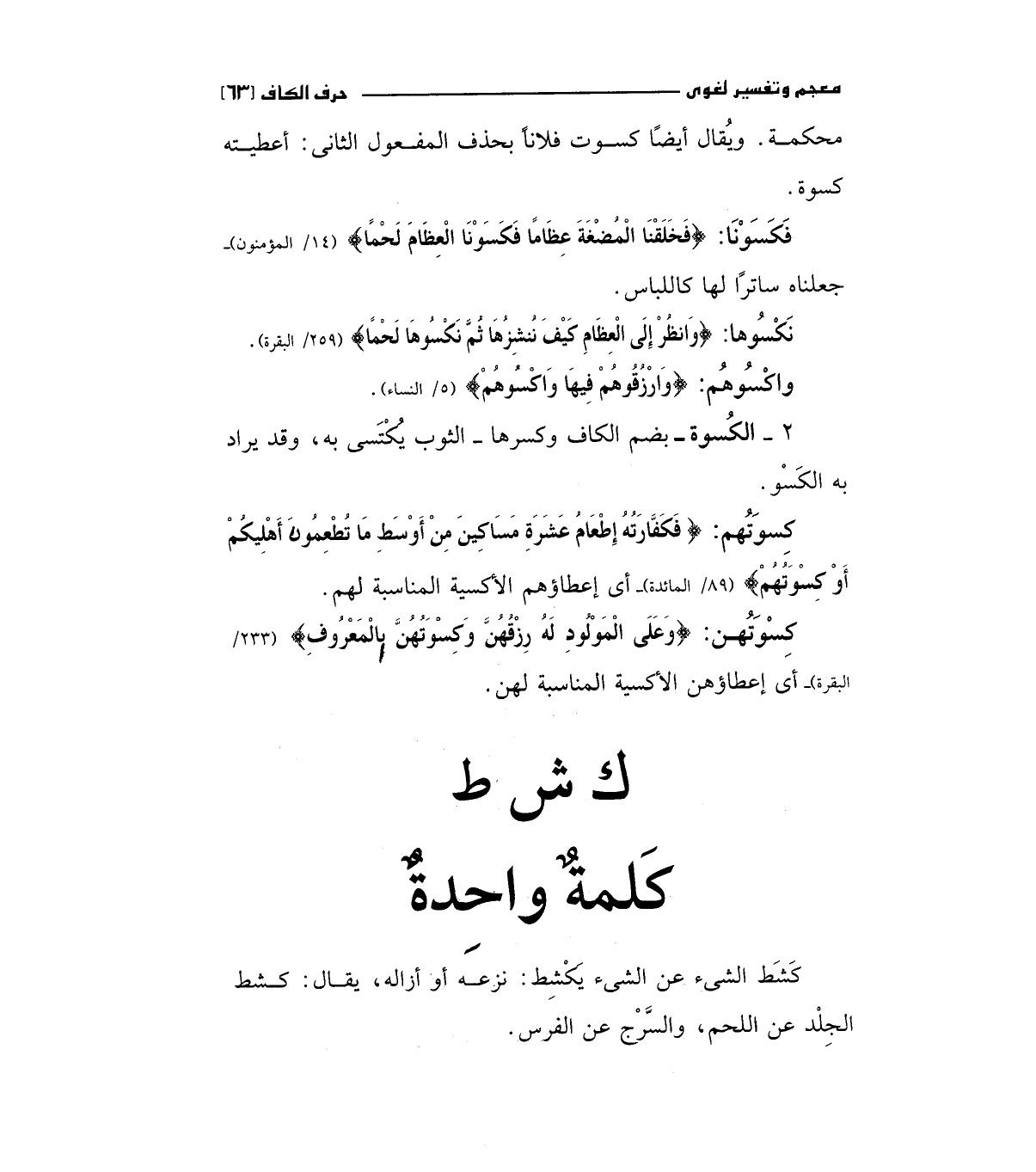 محكمة ويقال أيضا كسوت فلانا بحذف المفعول الثاني: أعطيته كسوة.