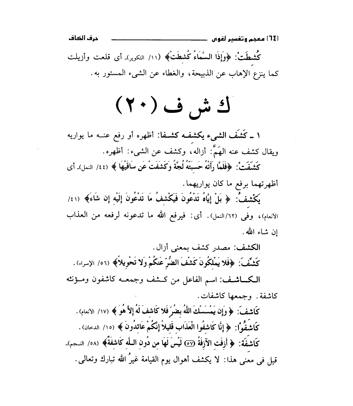 كشف: (فَلا يَمْلِكُونَ كَشْفَ الضُّرِّ عَنكُمْ وَلا تَحْوِيلاً) " 56/الإسراء" الكاشف: اسم الفاعل من كشف وجمعه كاشفون ومؤنثه كاشفة. وجمعها كاشفات.