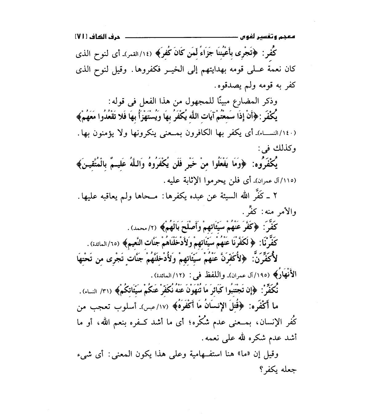 نكفر: (إِنْ تَجْتَنِبُوا كَبَائِرَ مَا تُنْهَوْنَ عَنْهُ نُكَفِّرْ عَنْكُمْ سَيِّئَاتِكُمْ) " 31/النساء " ما أكفره: (قُتِلَ الإِنْسَانُ مَا أَكْفَرَهُ) " 17/عبس" أسلوب تعجب من كفر الإنسان، بمعني عدم شكره، أي ما أشد كفره بنعم الله، أو ما أشد عدم شكره لله علي نعمه.