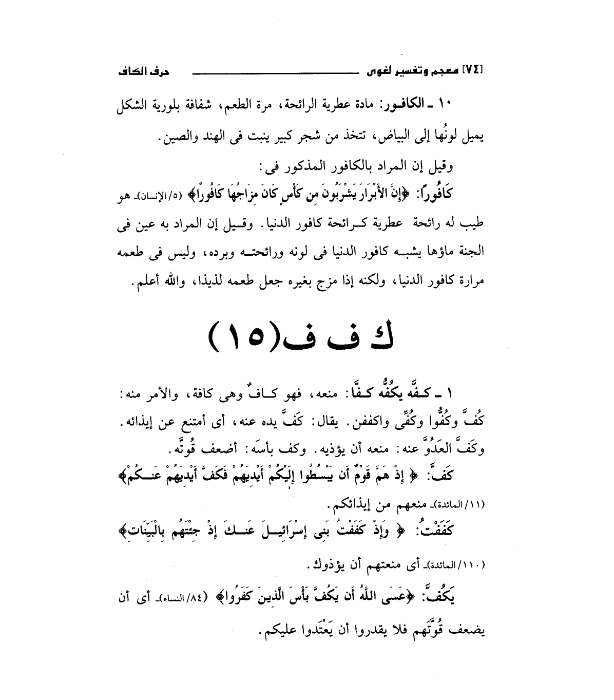 كف: (إِذْ هَمَّ قَوْمٌ أَنْ يَبْسُطُوا إِلَيْكُمْ أَيْدِيَهُمْ فَكَفَّ أَيْدِيَهُمْ عَنْكُمْ) " 11/المائدة " منعهم من إيذائكم.