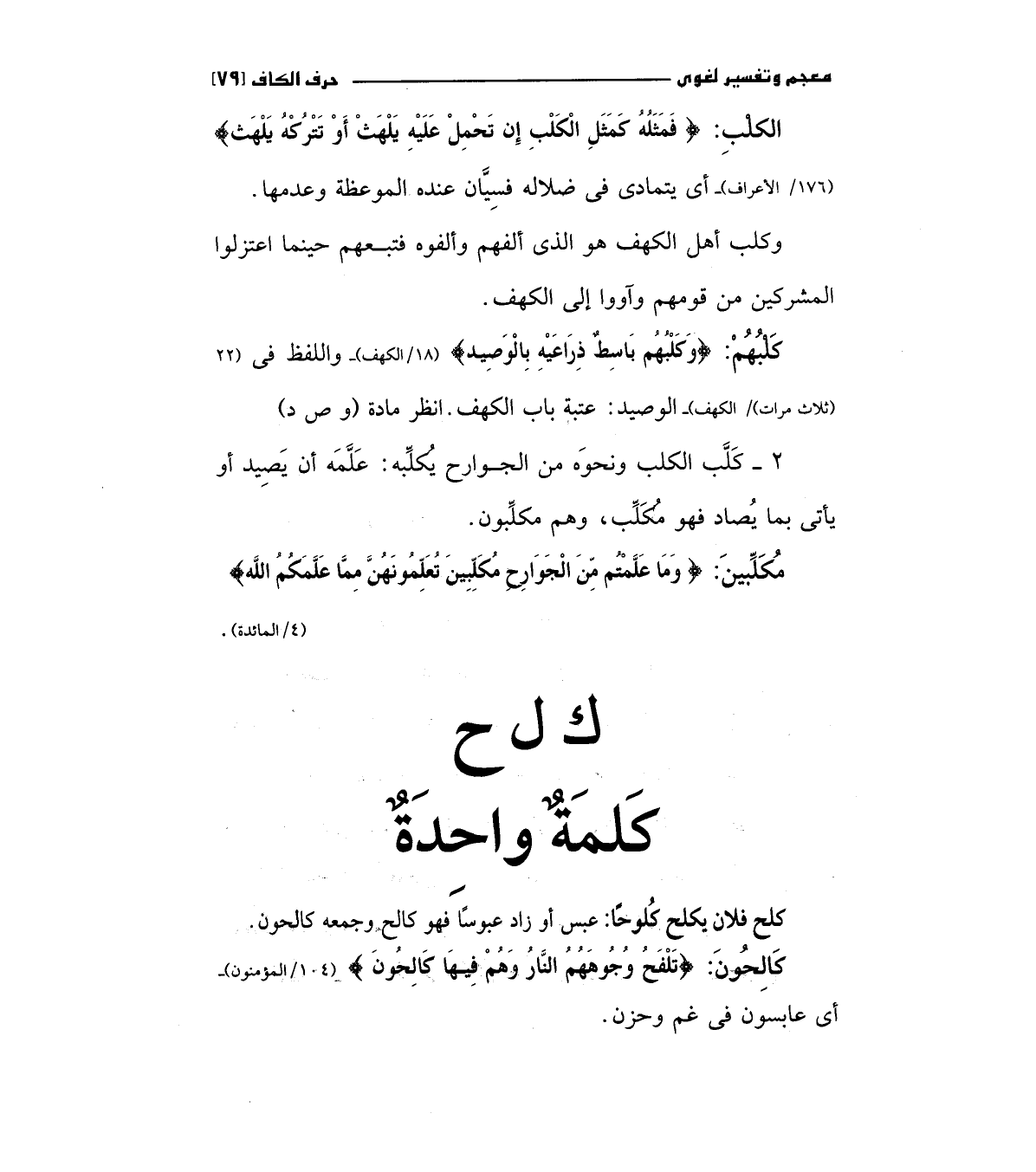 كلبهم: (وَكَلْبُهُمْ بَاسِطٌ ذِرَاعَيْهِ بِالْوَصِيدِ) " 18/الكهف " واللفظ في "22 ثلاث مرات / الكهف " الوصيد عتبة باب الكهف انظر مادة (وص د)