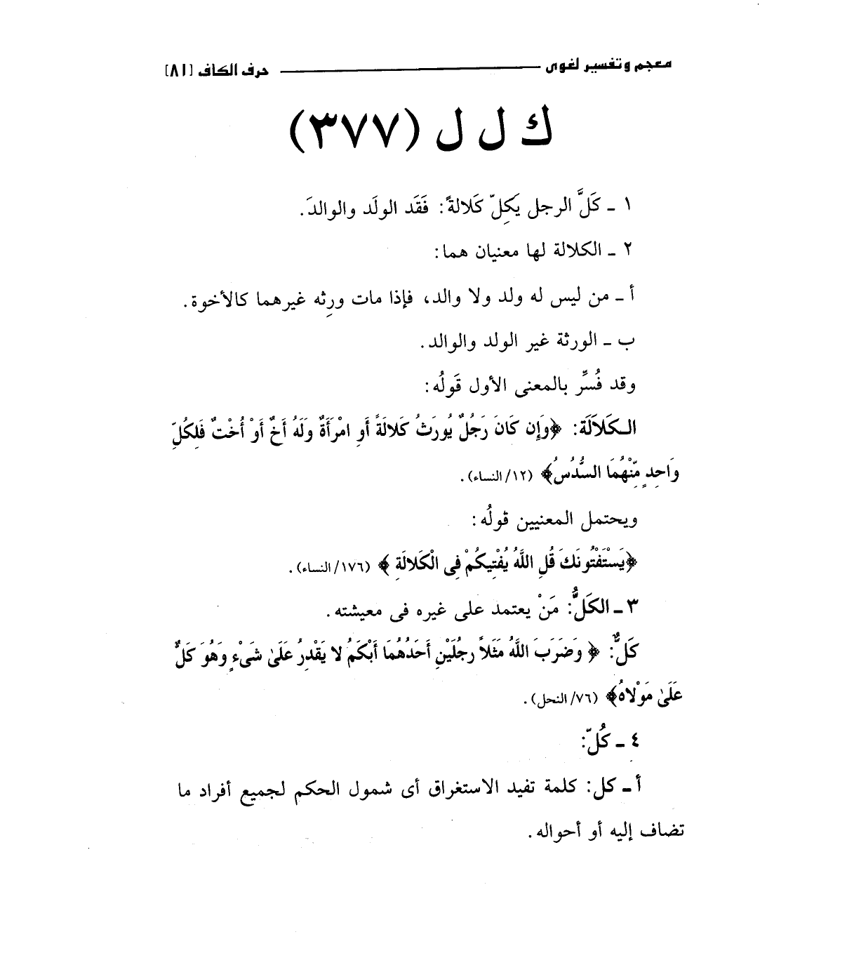 كل: (وَضَرَبَ اللَّهُ مَثَلاً رَجُلَيْنِ أَحَدُهُمَا أَبْكَمُ لا يَقْدِرُ عَلَى شَيْءٍ وَهُوَ كَلٌّ عَلَى مَوْلاهُ) (76/النحل).