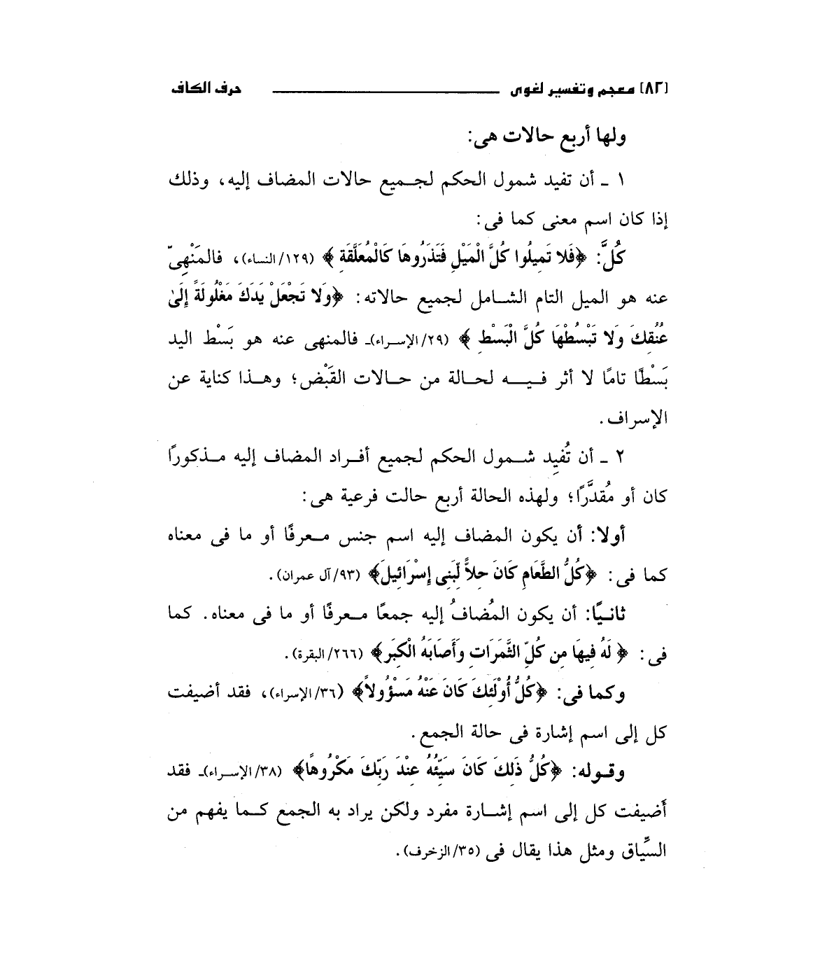ثانيا: أن يكون المضاف إليه جمعا معرفا أو ما فى معناه. كما فى: (لَهُ فِيهَا مِنْ كُلِّ الثَّمَرَاتِ وَأَصَابَهُ الْكِبَرُ) (266/ البقرة).