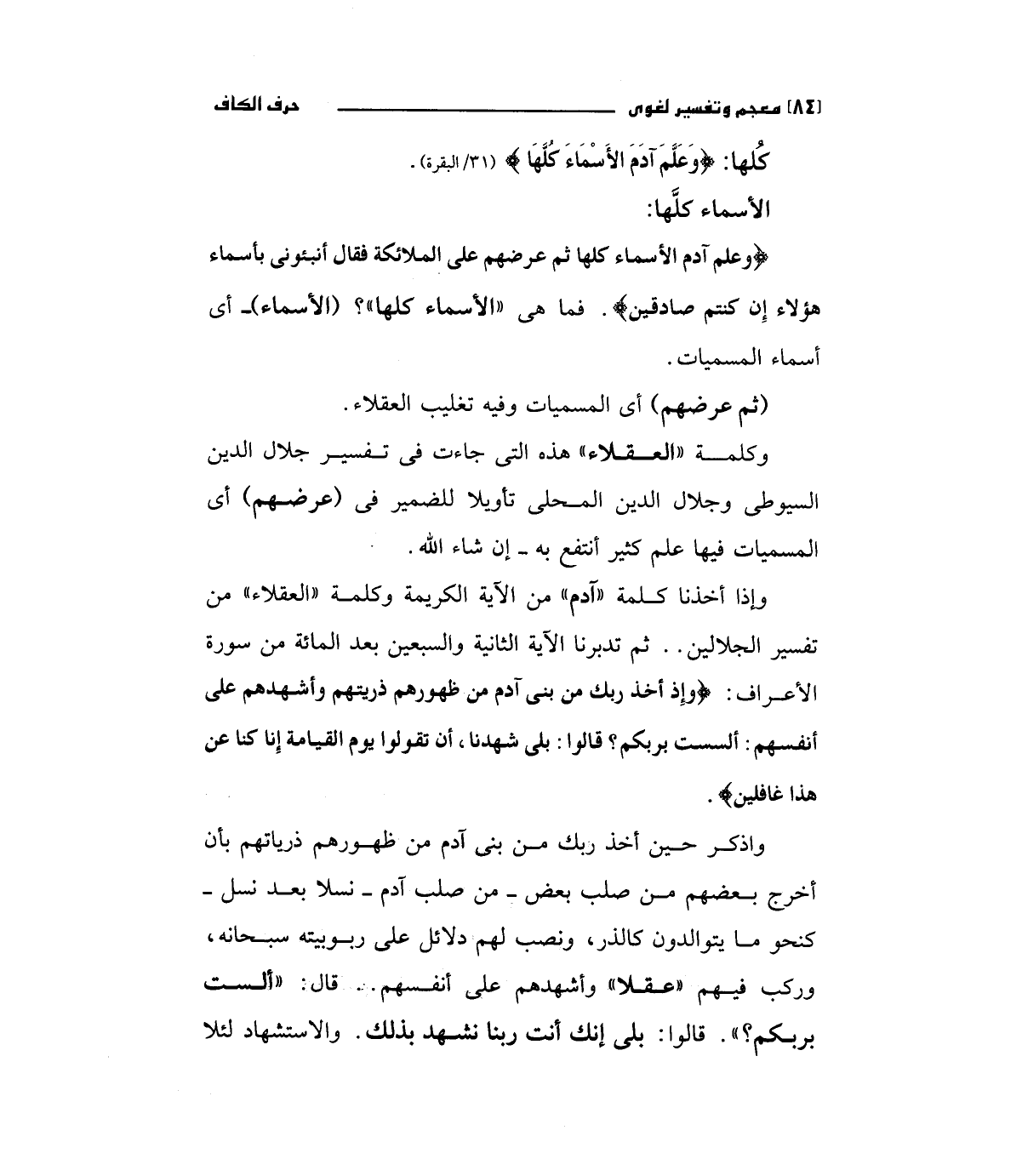 وإذا أخدنا كلمة "آدم " من الآية الكريمة وكلمة " العقلاء" من تفسير الجلالين ... ثم تدبرنا الآية الثانية والسبعين بعد المائة من سورة الأعراف: (وإذ أخذ ربك من ينى آدم من ظهورهم ذريتهم وأشهدهم على أنفسهم: ألست بربكم؟ قالوا: بلى شهدتا، أن تقولوا يوم القيامة إنا كنا عن هذا غافلين).