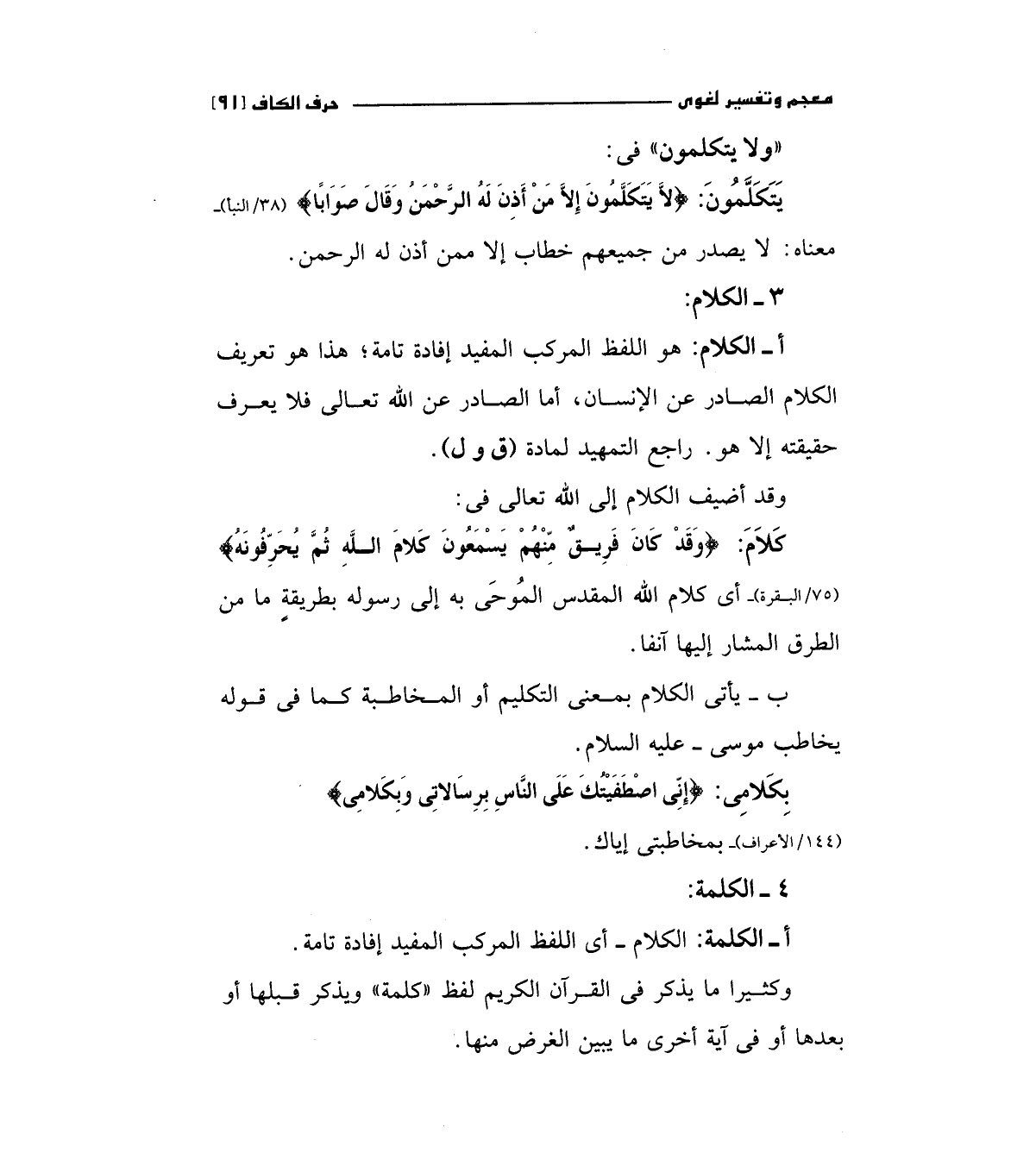 أالكلام: هو اللفظ المركب المفيد إفادة تامة، هذا هو تعريف الكلام الصادر عن الإنسان، أما الصادر عن الله تعالي فلا يعرف حقيقته إلا هو راجع التمهيد لمادة (ق ول).